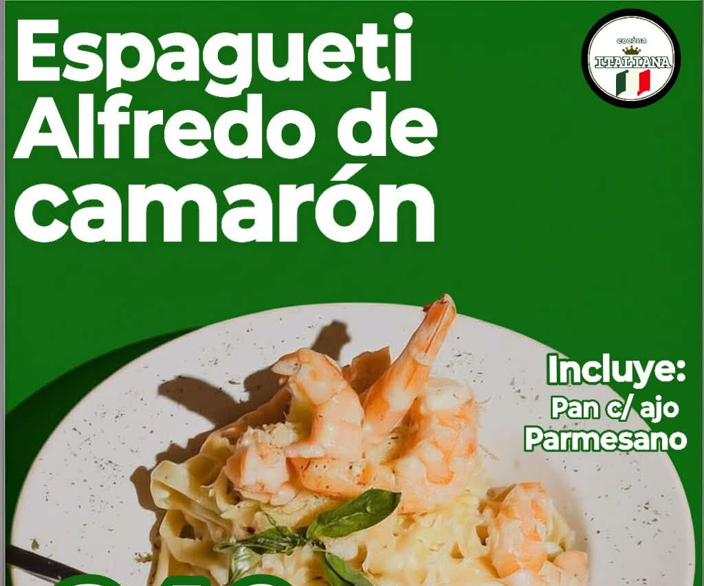 Una opción elegante y deliciosa. Pasta fettuccine perfectamente cocida, envuelta en nuestra cremosa y tersa salsa Alfredo. Coronada con camarones grandes y jugosos, y un toque de albahaca fresca para un aroma inigualable. Incluye: Pan de ajo artesanal y queso parmesano extra para personalizar tu plato.