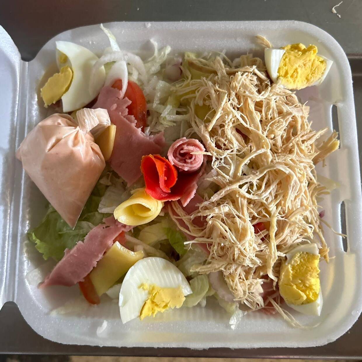 Pollo deshebrado, queso manchego, jamón, jitomate, huevo, lechuga romana y aderezo a base de mayonesa y salsa de jitomate