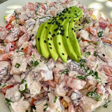 Pulpo suave mezclado en pico de gallo, con aguacate y mayonesa.