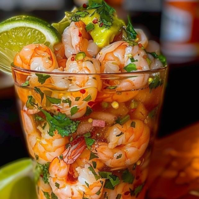 Camaron curtido bañados en una mezcla fresca de chile serrano, limón y cilantro, directo picosito y bien sabroso.