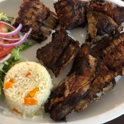 Bañada en ajo servida con arroz y ensalada.