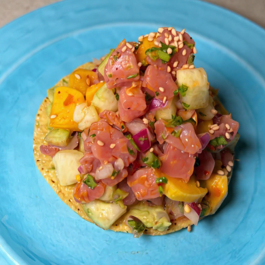 Dados de atun y mango con salsa de la casa. Chile chiltepin, pepino, cebolla morada y cilantro. Un contraste perfecto entre lo picante y lo dulce.