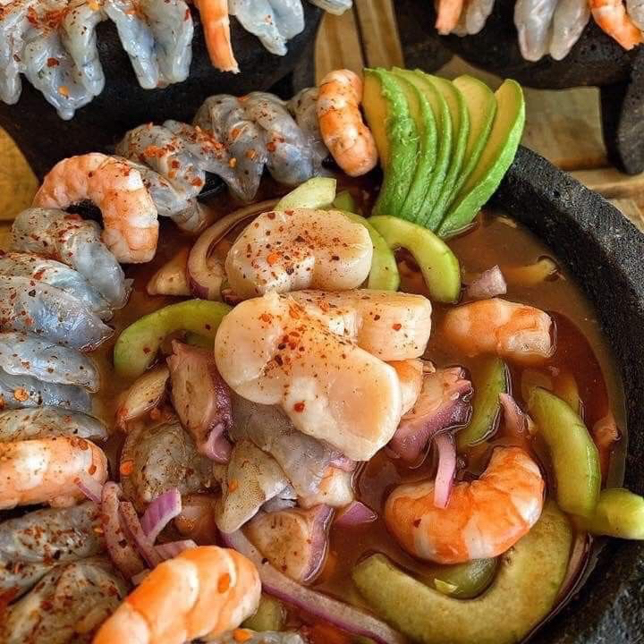 Molcajete con camaron cocido, camaron curtido, pulpo, atun y callo acompañado de pepino, cebolla morada y cilantro con un salseado especial de la casamas chiltepin.