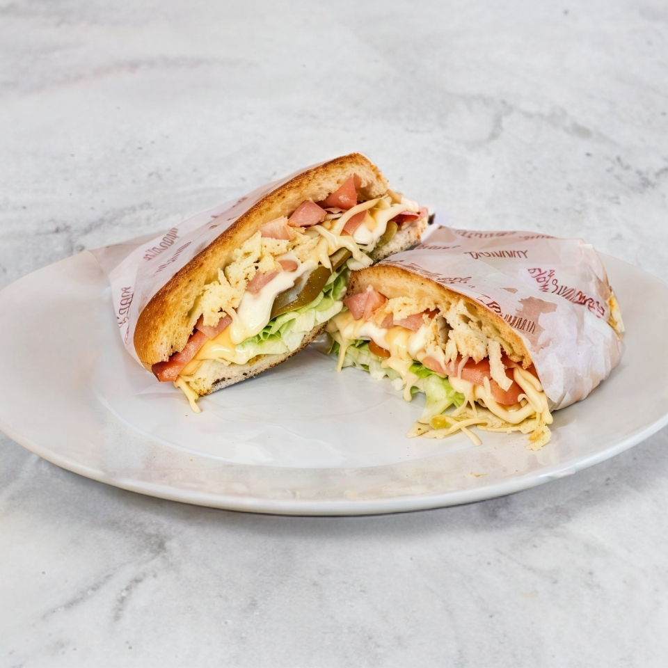 Torta combinada con pierna de cerdo, pollo, jamón, salchicha, chorizo, queso oaxaca y queso amarillo.