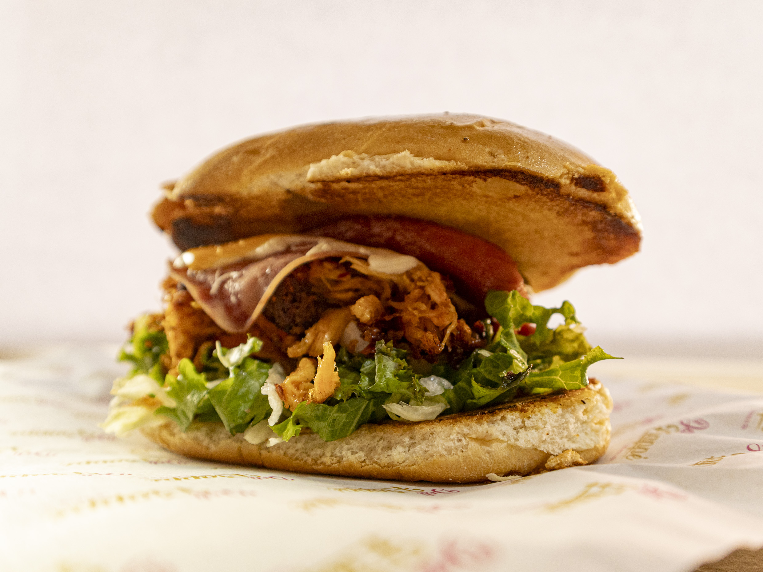 100g de milanesa de res crujiente y queso oaxaca, acompañada de lechuga, jitomate, cebolla, aguacate y chiles en rajas