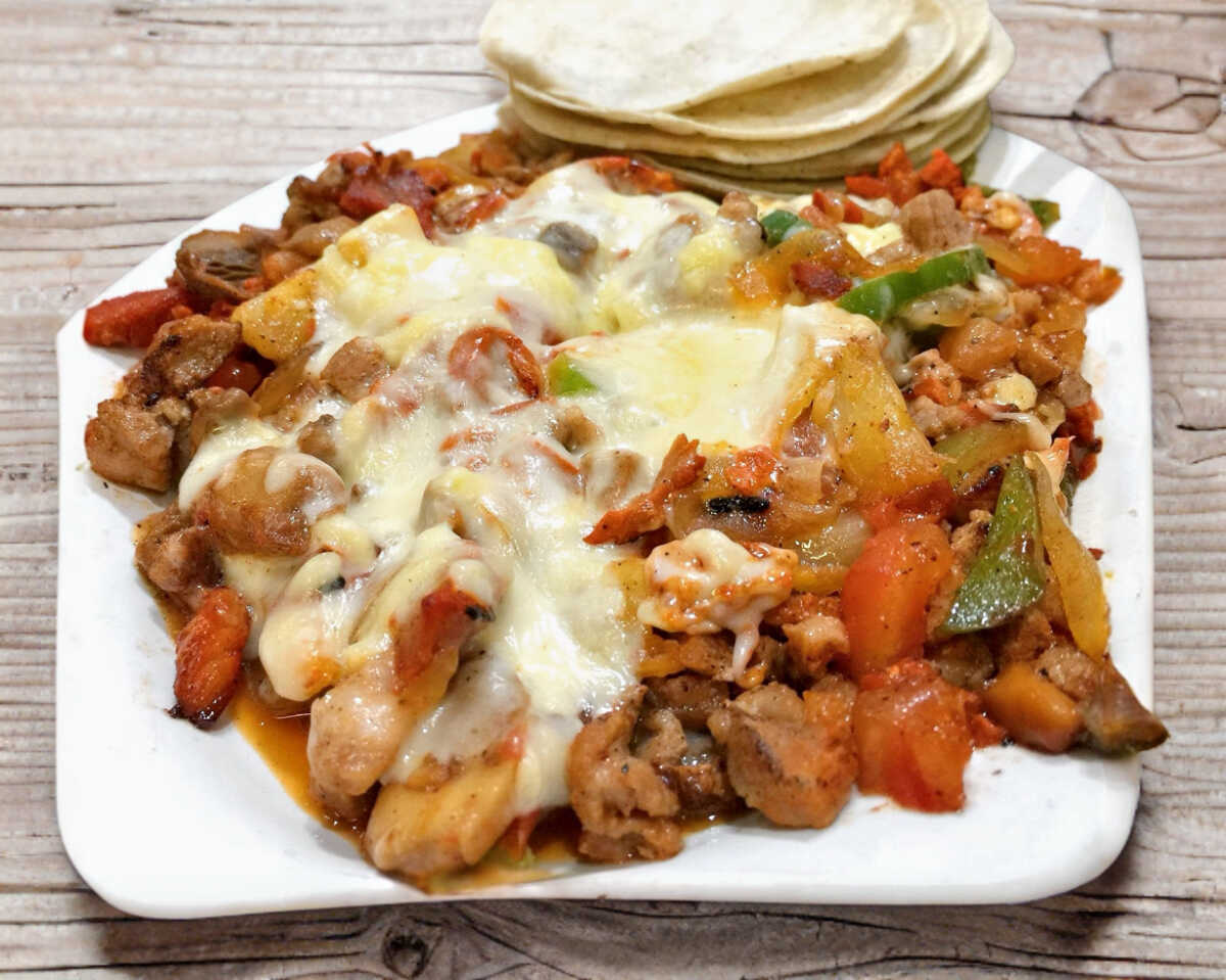 Pechuga de pollo, cebolla, pimiento, jitomate, champiñones y queso.