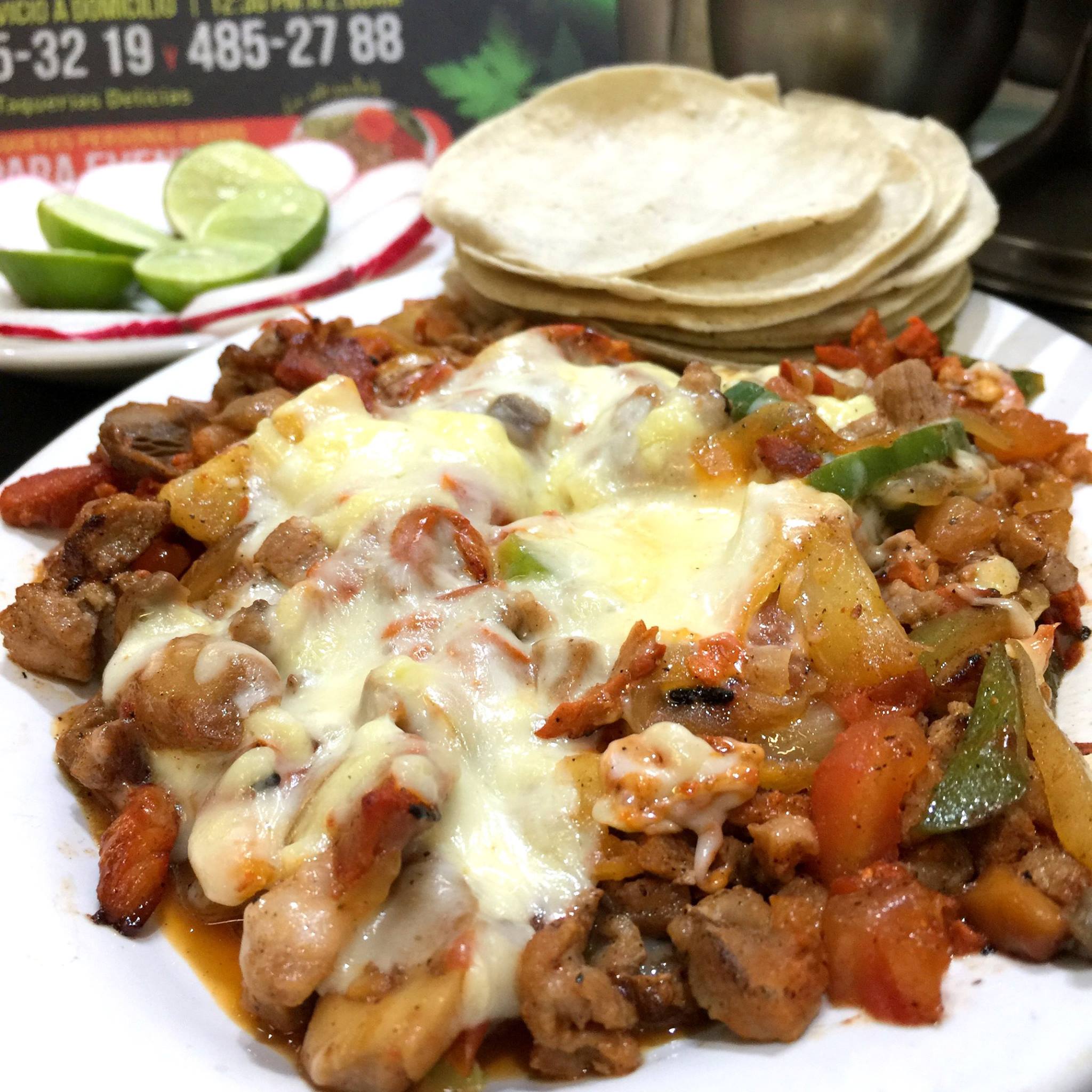 Chuleta, chorizo, nopal, cebolla, pimiento, champiñones y queso.
