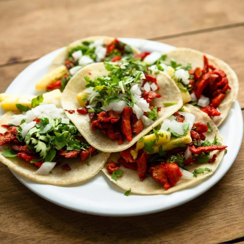 5 Piezas , acompañado de cilantro, cebolla, piña y salsas, frijolitos y ceboolas curtidas