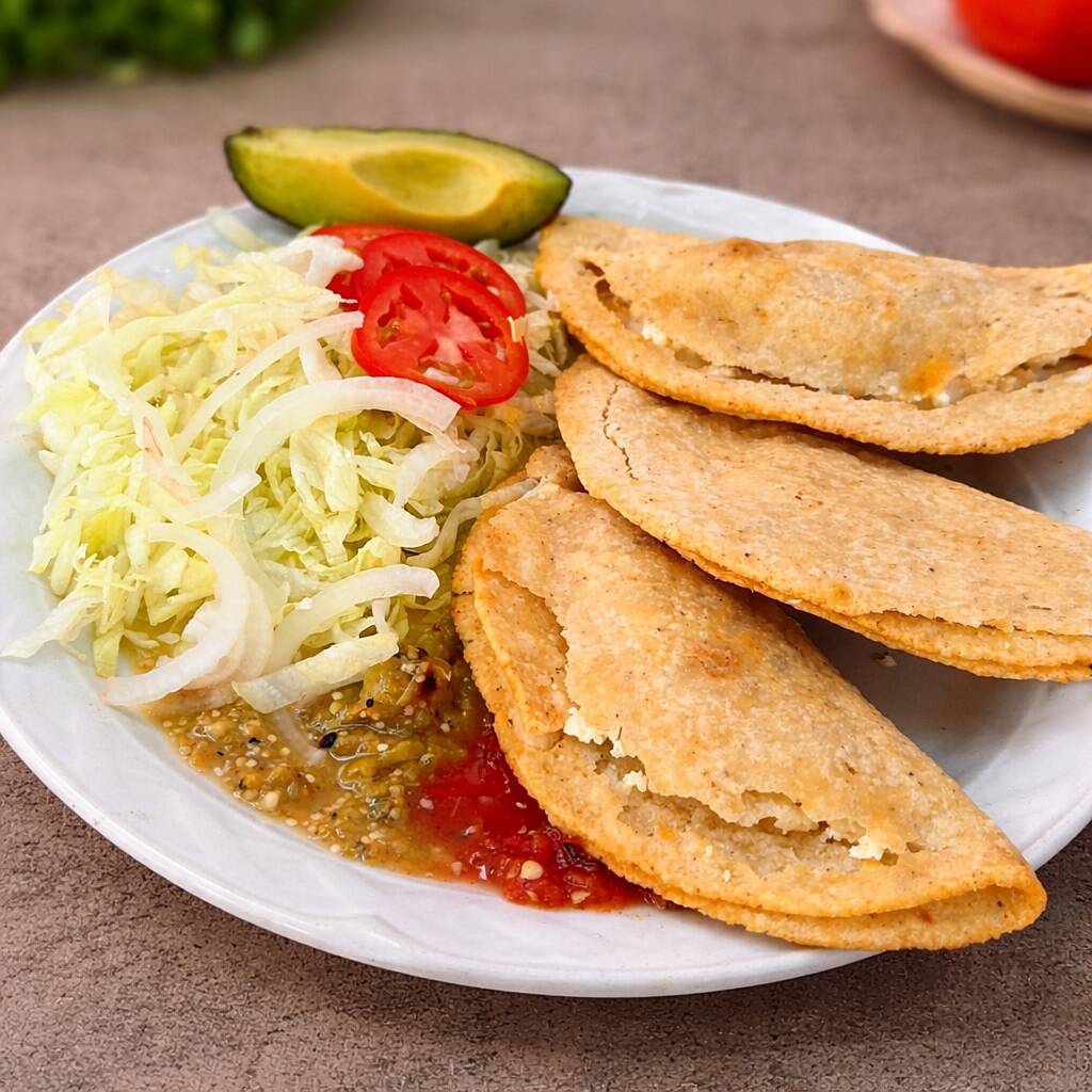 Orcen de 3 piezas, Deliciosas quesadillas elaboradas con masa (hechas a mano) y fritas al momento para lograr una textura crujiente por fuera y suave por dentro. Elige tu guiso favorito: | Pollo guisado | Chorizo con papa | Flor de calabaza | Champiñones |. Acompañadas de lechuga fresca, jitomate, cebolla, aguacate y salsa. Perfectas para disfrutar un antojo tradicional, casero y lleno de sabor.