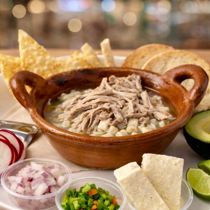 "Prueba nuestro pozole blanco de pollo, con pechuga tierna y maíz, una opción ligera y perfecta para disfrutar en cualquier momento."