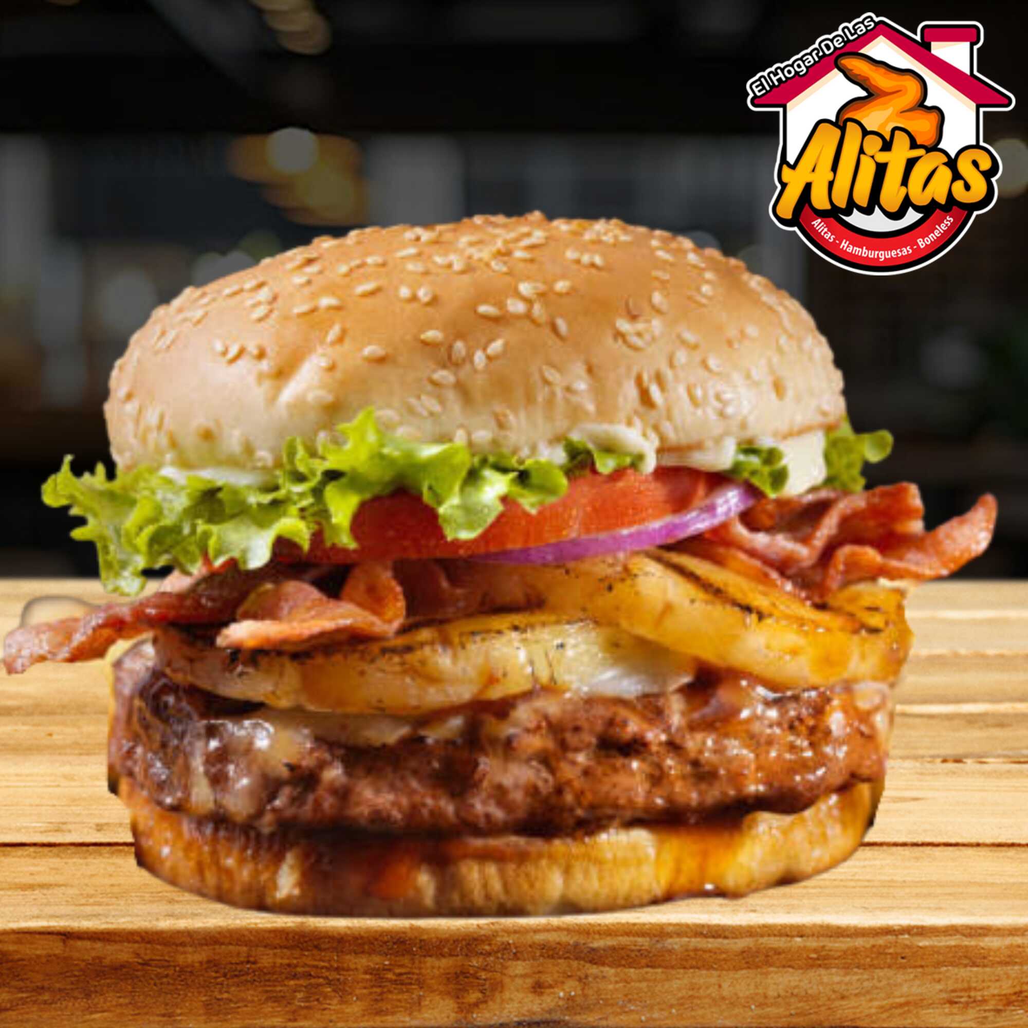 Carne de res, queso mozzarella, jamón, piña sazonada con BBQ, jitomate, cebolla, lechuga, chile, mayonesa, mostaza y catsup