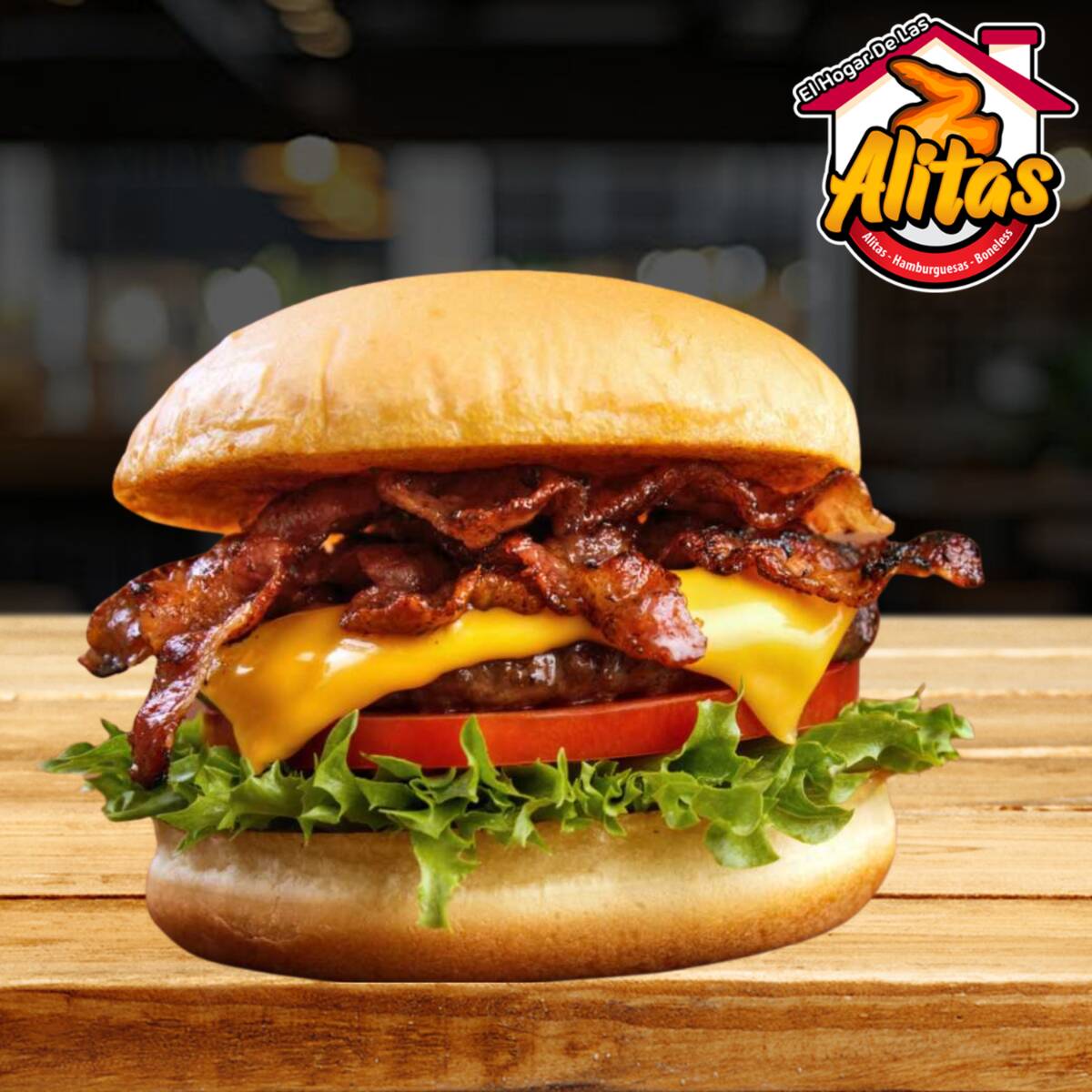 Carne de res, tocino, queso amarillo, jitomate, cebolla, lechuga, chile, mayonesa, mostaza y catsup.