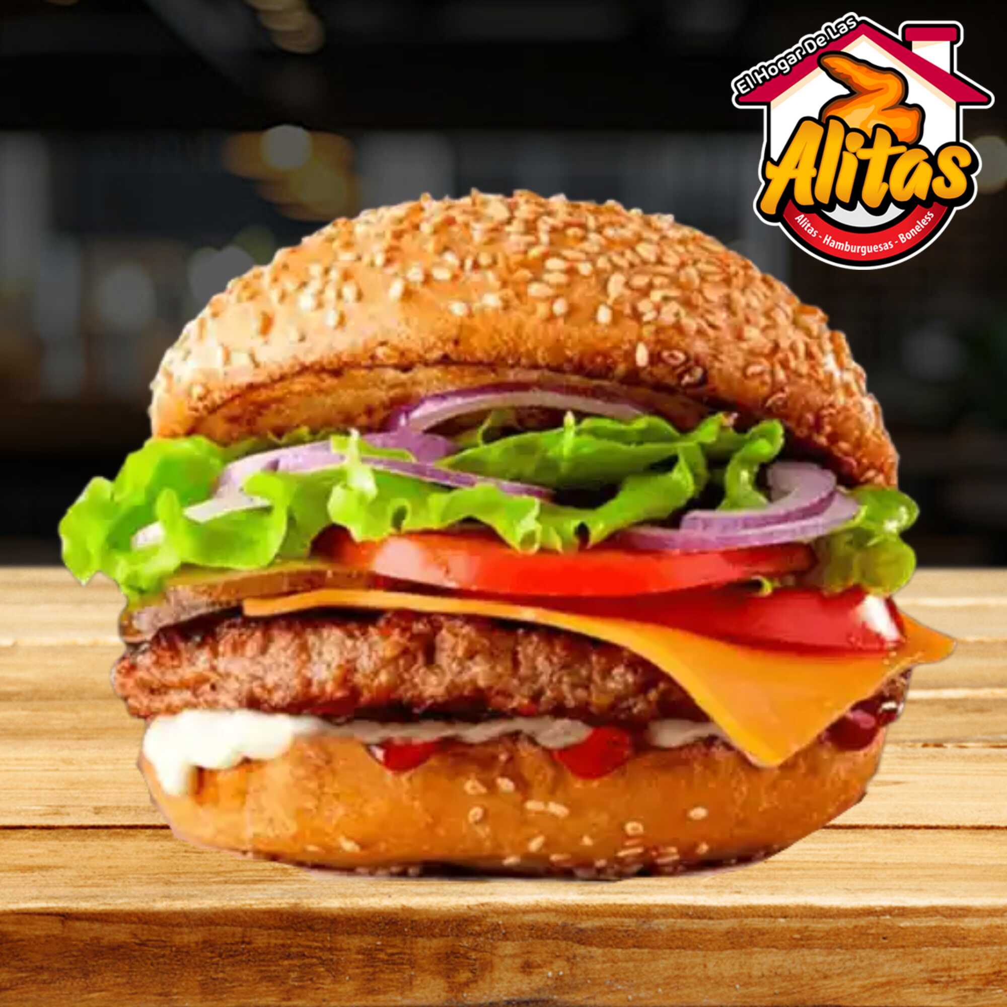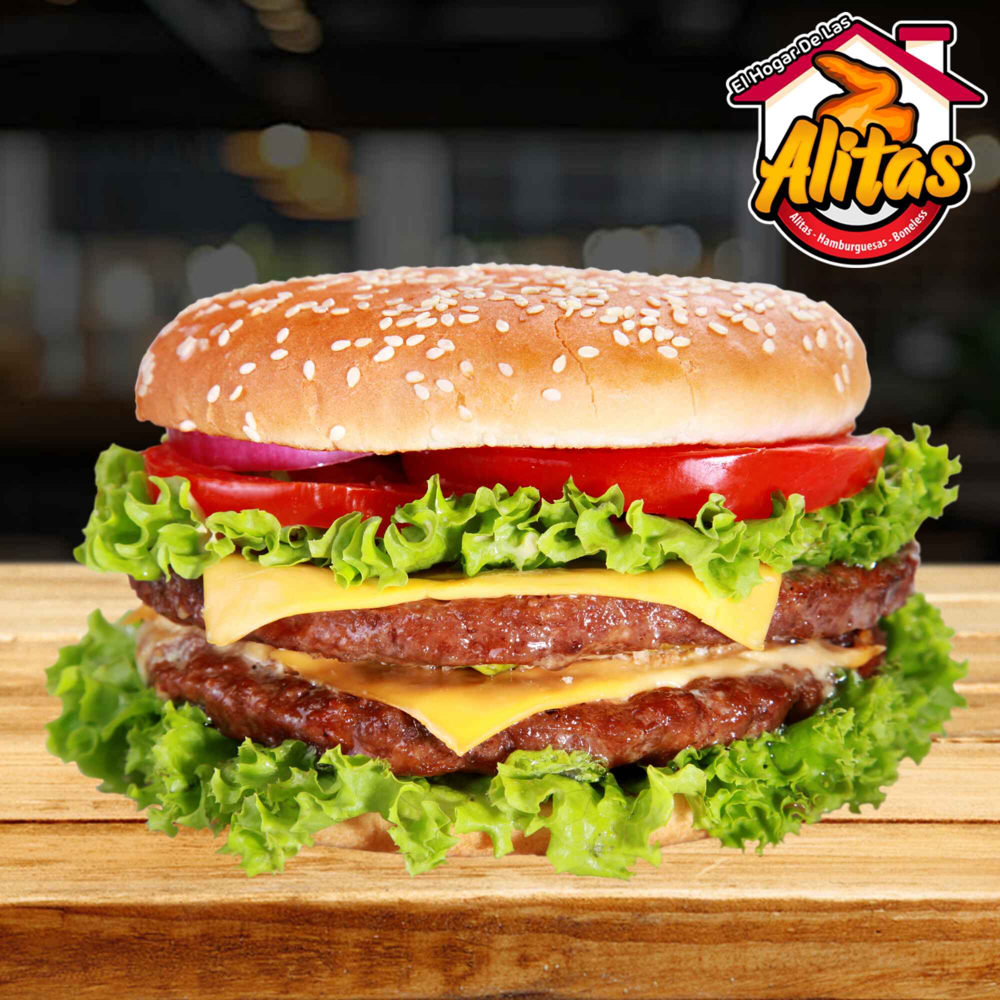 Doble carne de res, doble queso amarillo, jitomate, cebolla, lechuga, chile, mayonesa, mostaza y catsup.