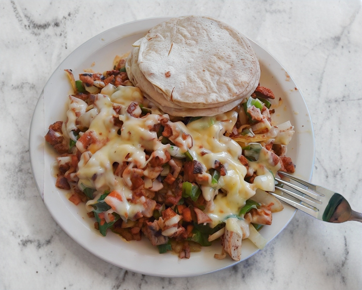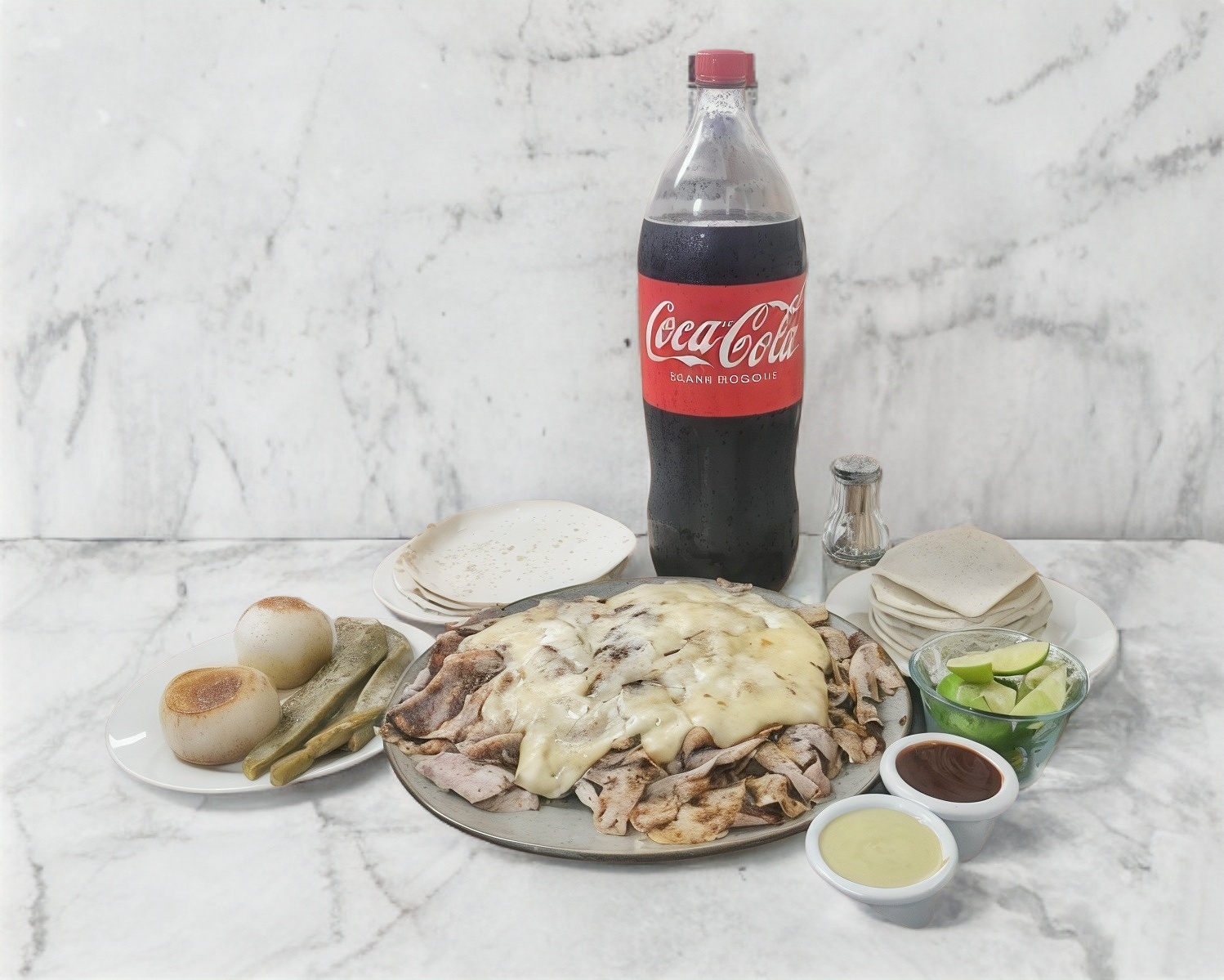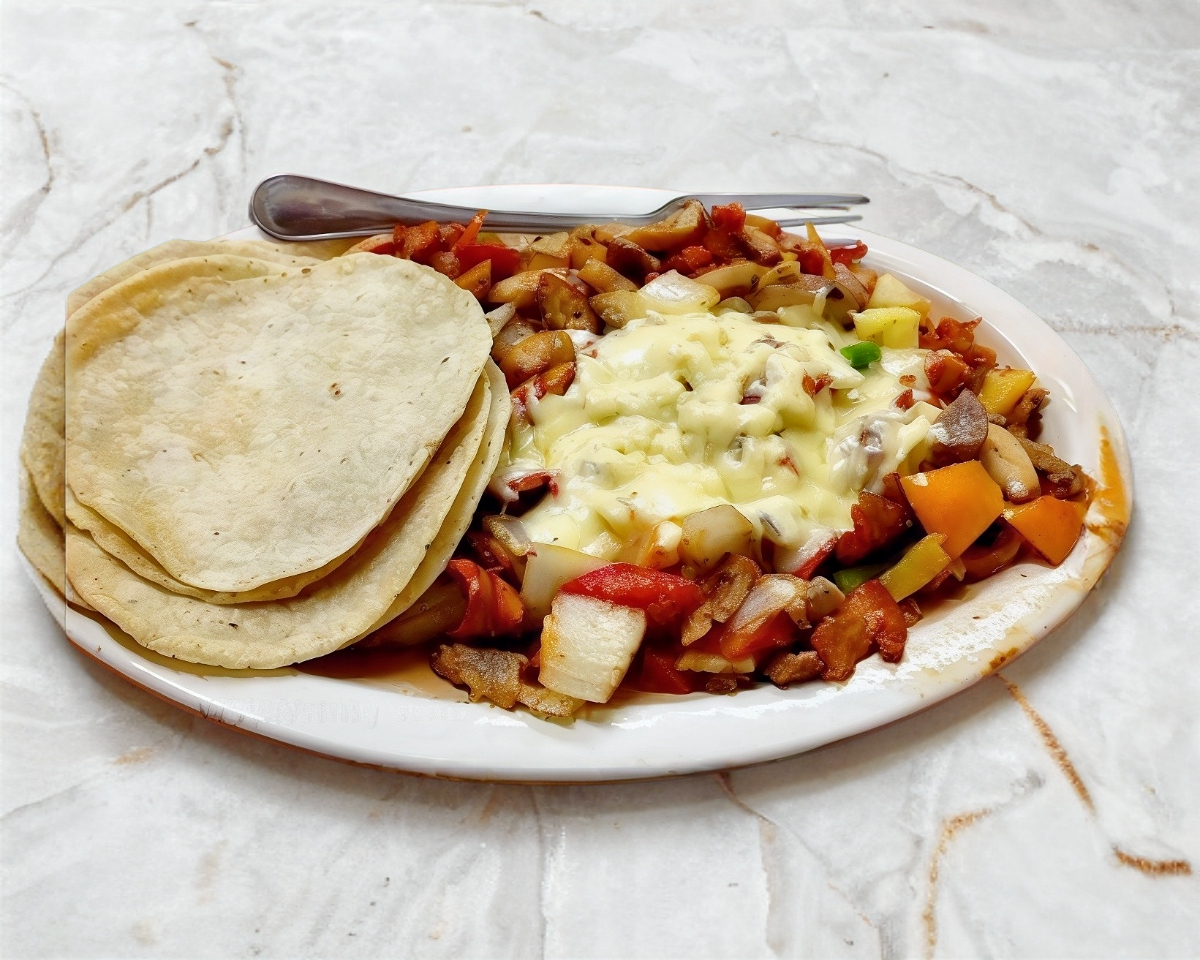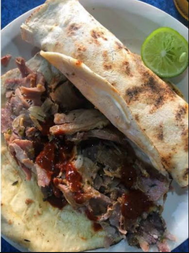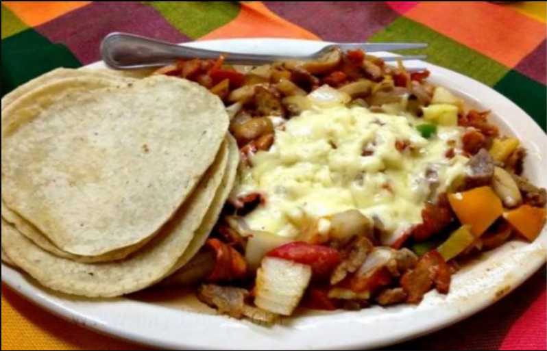 Platillo preparado con carne árabe, queso gouda, pimiento morrón, jamón y tocino, se acompaña de tortillas de maíz, limones y salsa a elegir.