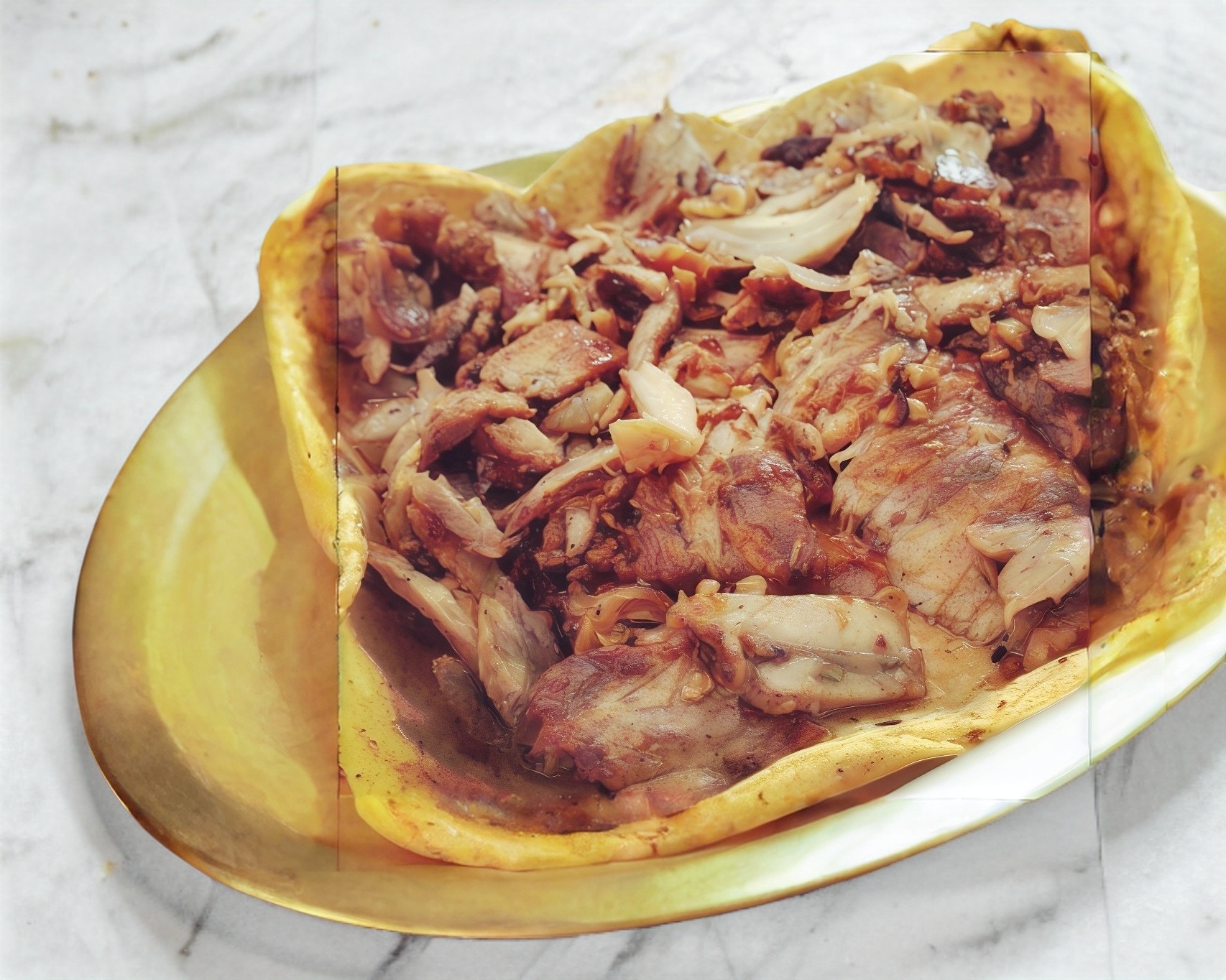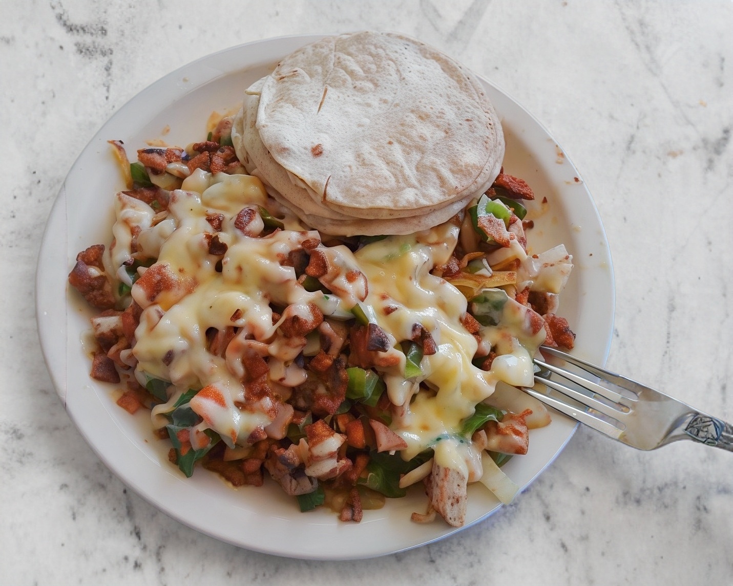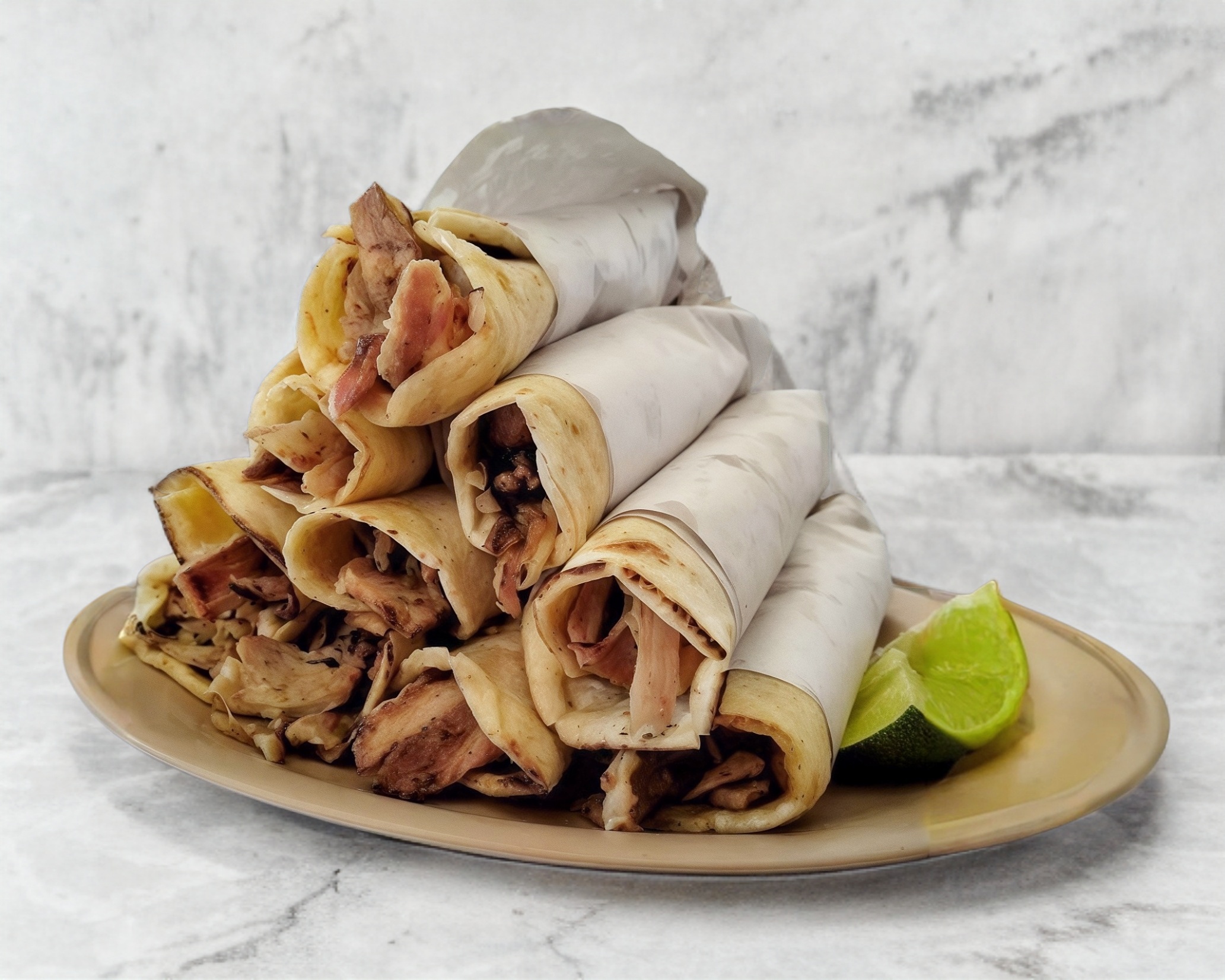 Platillo preparado con carne árabe, queso gouda, pimiento morrón, jamón y tocino, se acompaña de tortillas de maíz, limones y salsa a elegir.