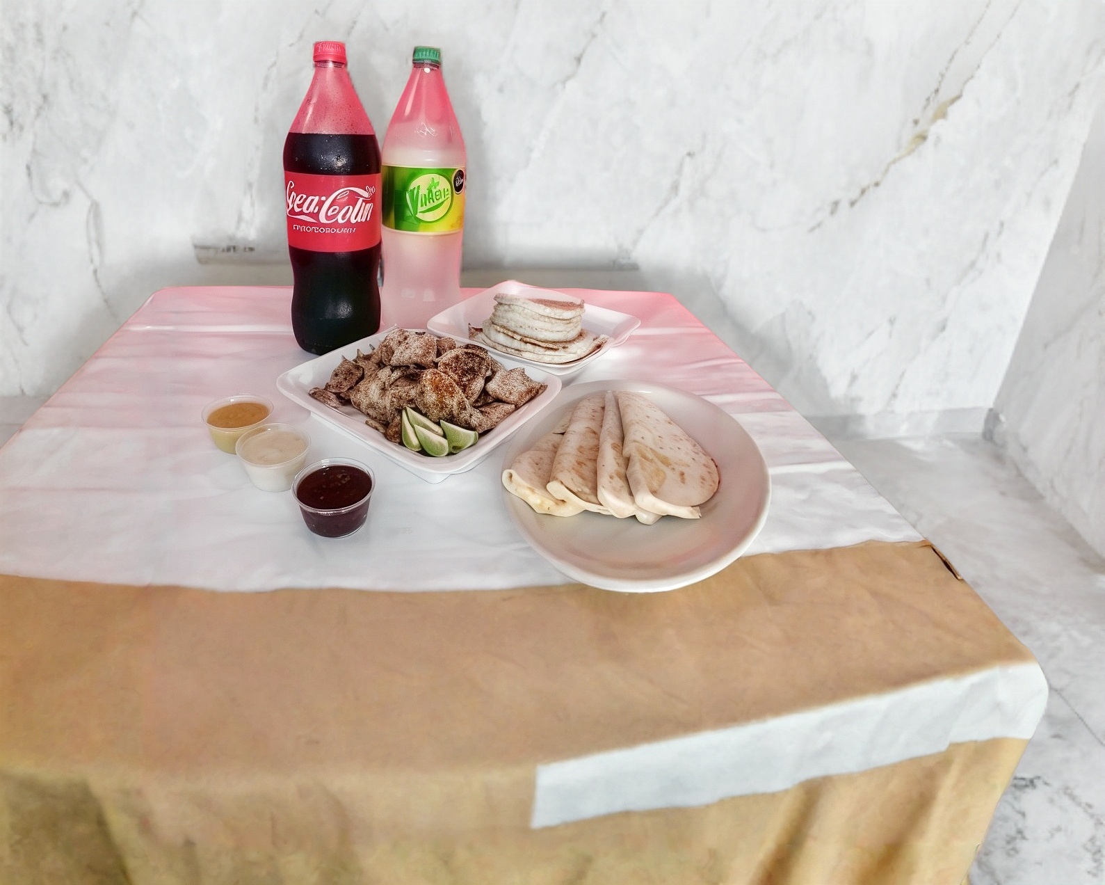 Incluye 6 pzas de pan pita (taco árabe), tortillas de maíz, limones y salsa de piña, verde y chipotle.