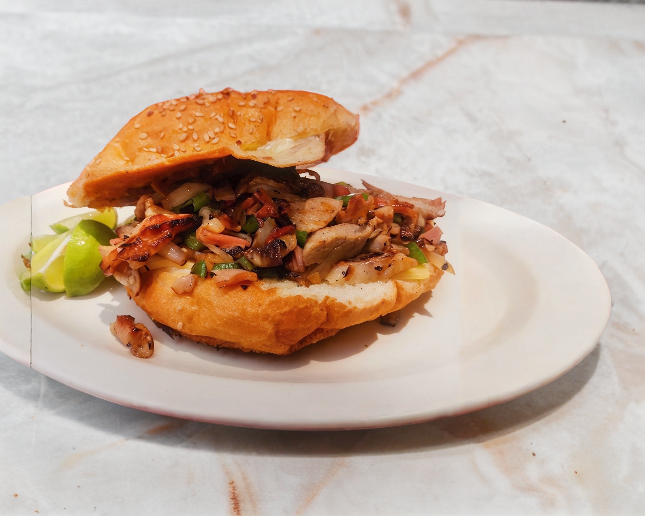 Cemita especial, preparada con carne árabe, queso gouda, morrón, jamón y tocino, acompañada de limones y salsa a elegir.