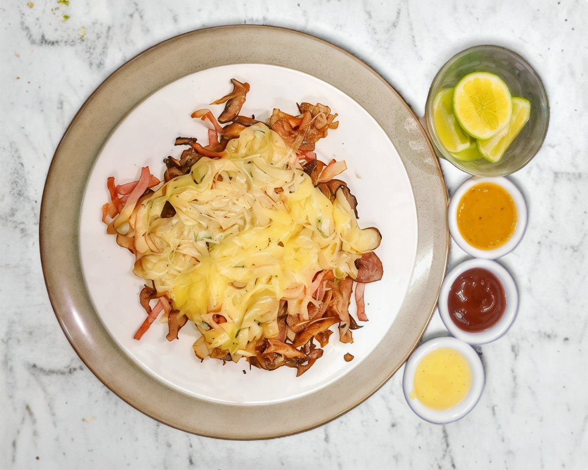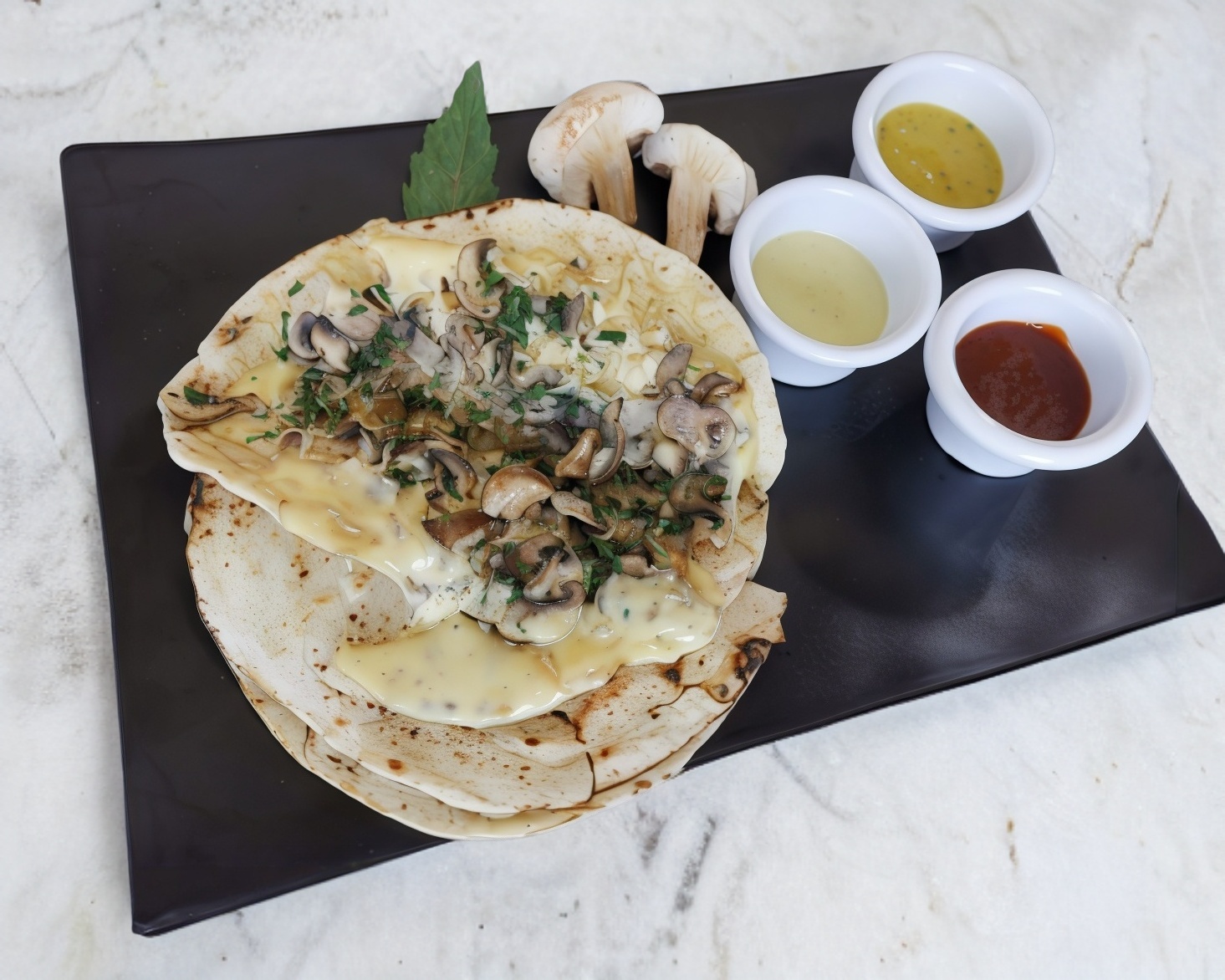 Preparada con pan pita, champiñones y queso gouda, incluye salsa a elegir y limones.