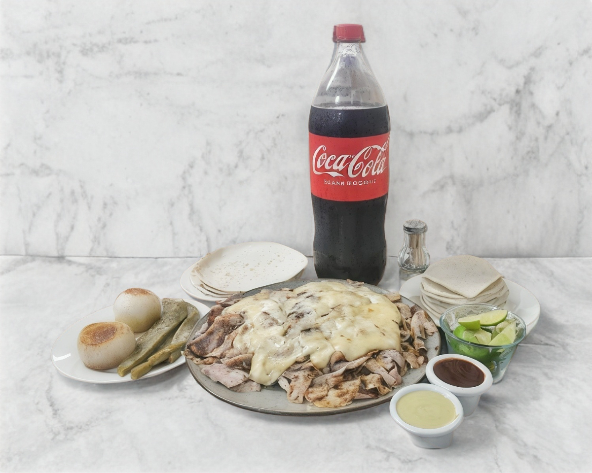 Carne árabe, bistec, tocino, chorizo, queso Gouda, acompañada de tortillas de maíz, salsas de piña, verde, chipotle y limones