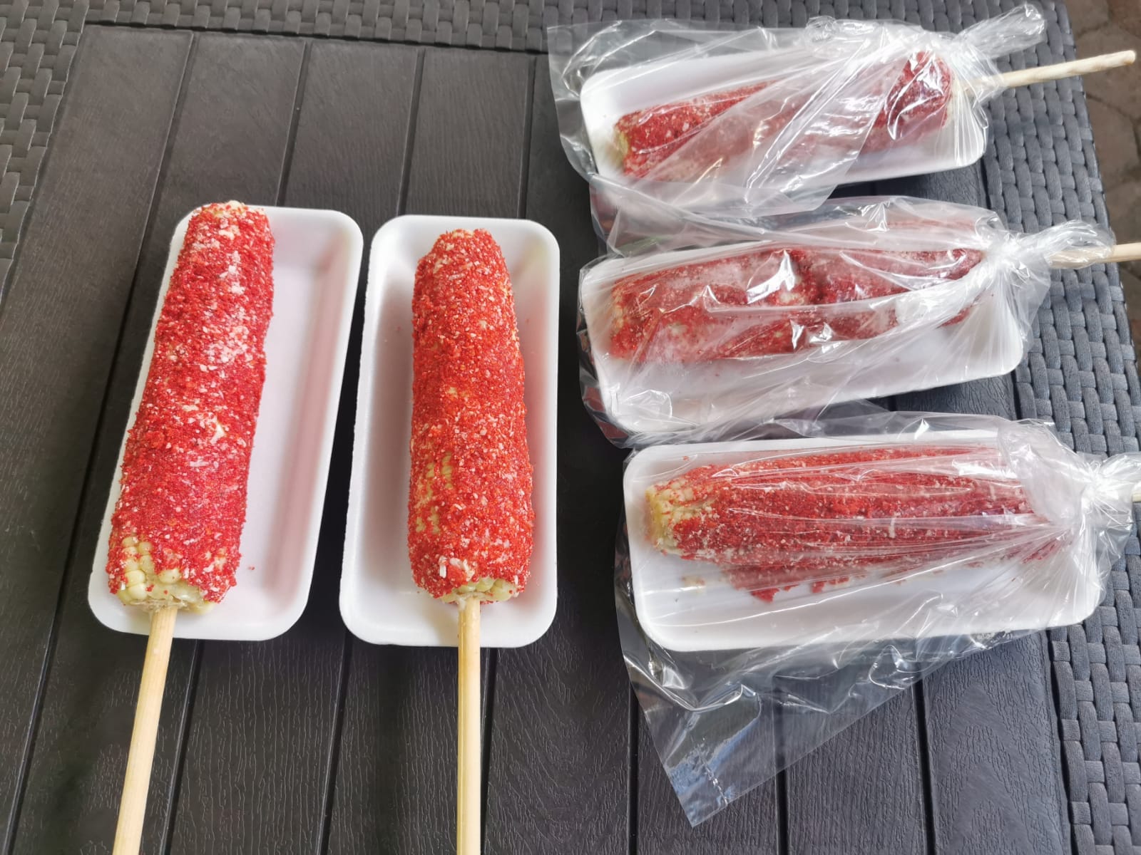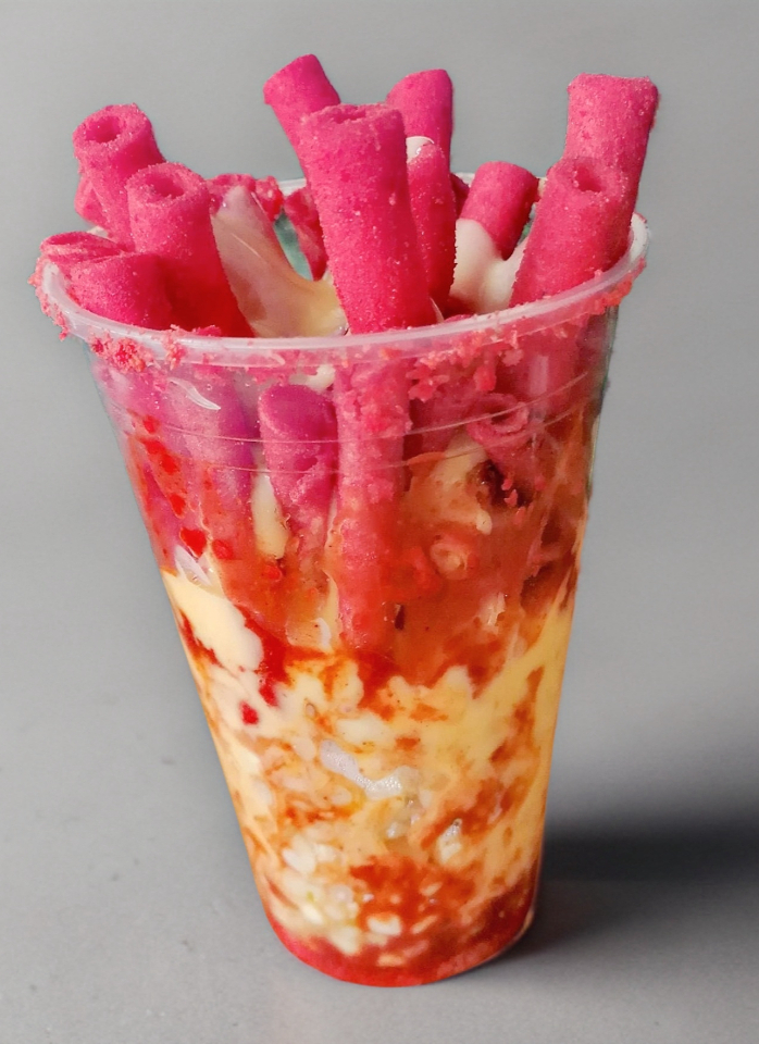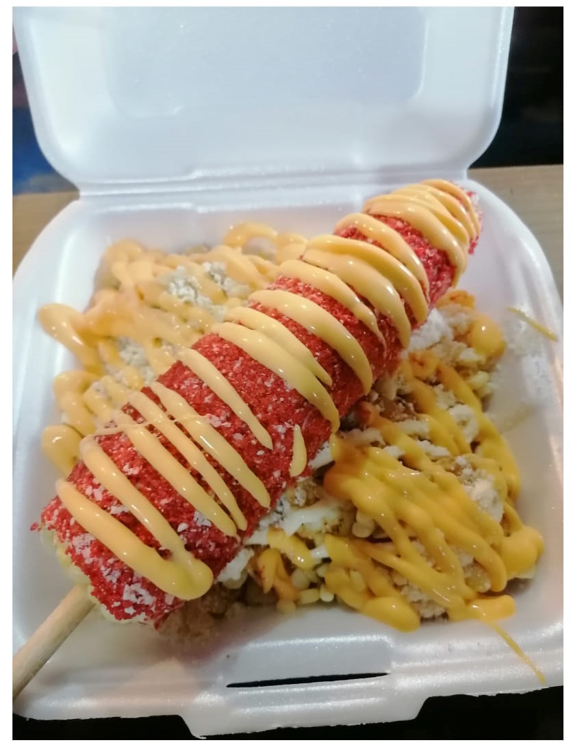 Takis Fuego, Esquite, Salsa Preparada, Mayonesa, Queso Cheddar y Polvo Flaming