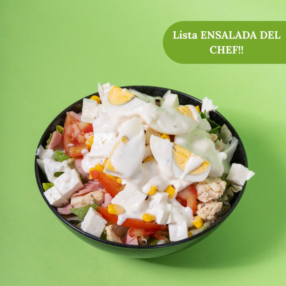 Ensalada del chef contiene 180 gr de un mix de lechugas, Pollo a la parrilla, queso panela, jamón de pavo, huevo hervido, elote, jitomate, cacahuate, queso parmesano y aderezo mil islas.