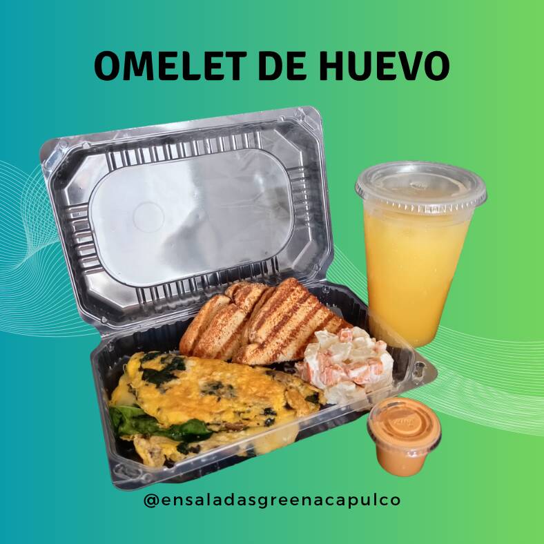 Omelette de huevo con dos ingredientes a elegir, jamón de pavo y queso manchego, 2 piezas de pan integral, ensalada rusa y un aderezo, este desayuno incluye una bebida (cafe o jugo de naranja)
