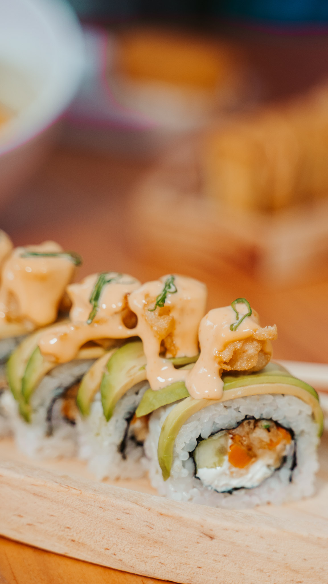Por dentro, Camaron tempura, kakiage y aguacate. Por fuera Queso philadelphia y salmon horneado; con un toque de salsa estilo barra vieja.