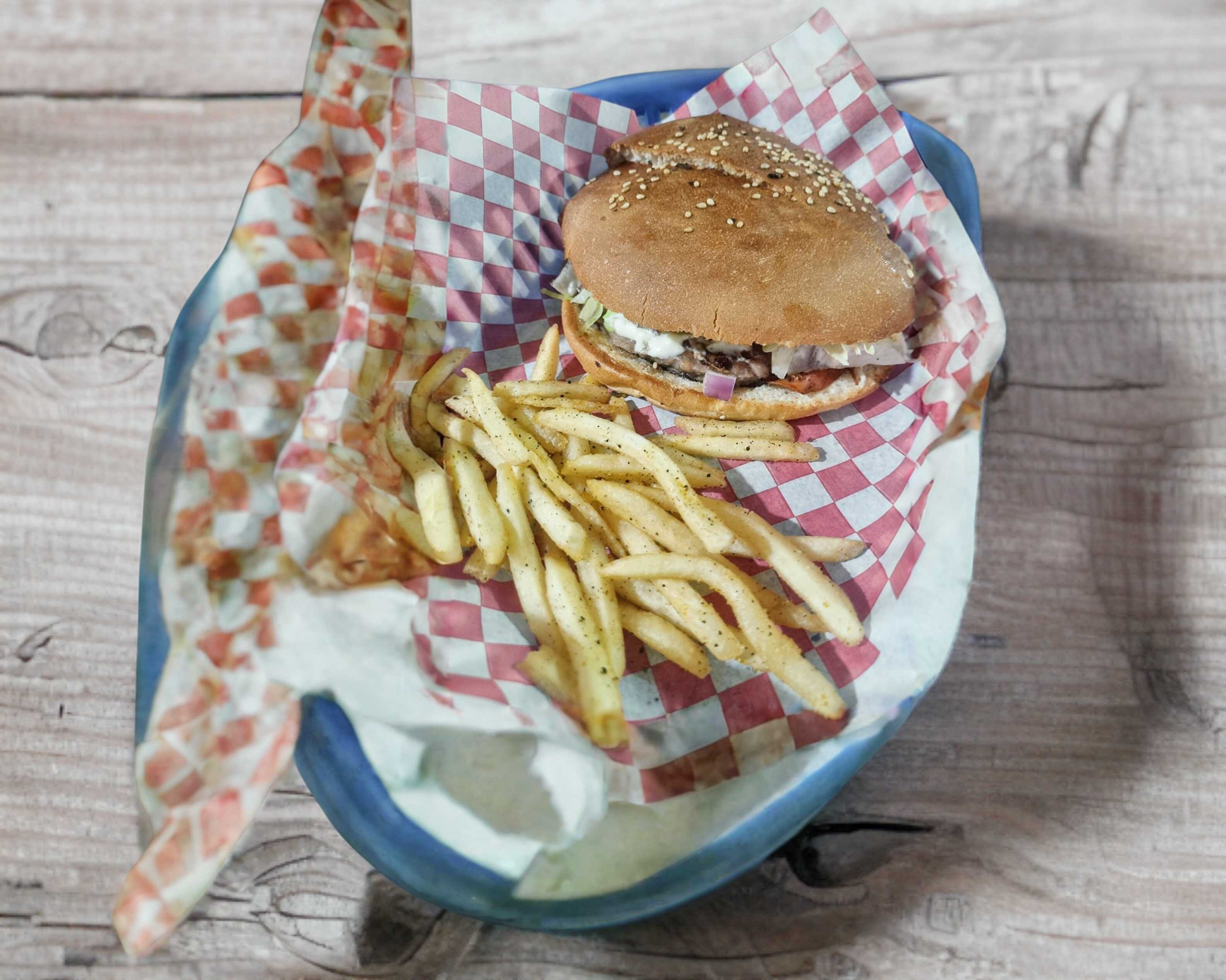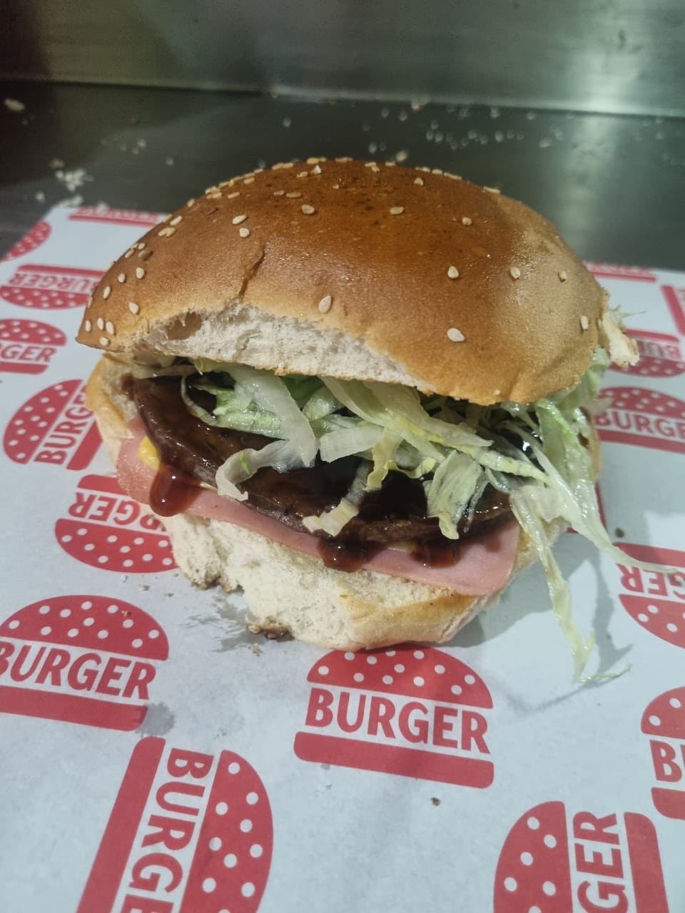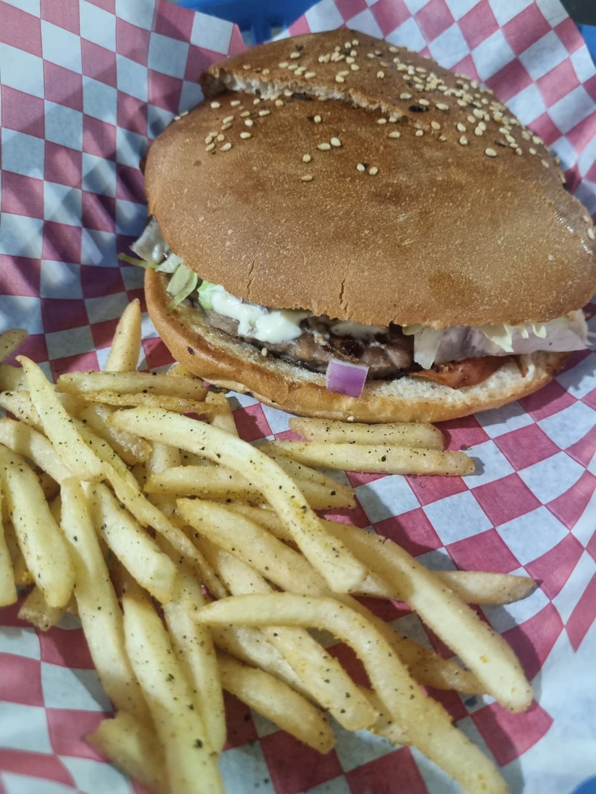 Carne de res, jamón, queso amarillo, salsa bbq, cebolla, jalapeño y lechuga romana, con una orden de papas individuales.