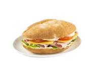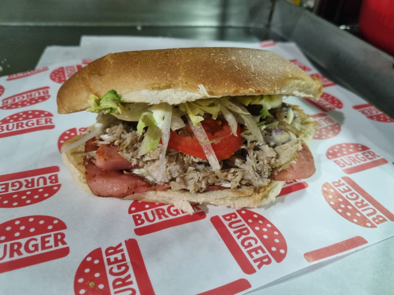 Jamón, salchicha y queso oaxaca, lechuga romana, cebolla, jitomate, jalapeño y mayonesa.