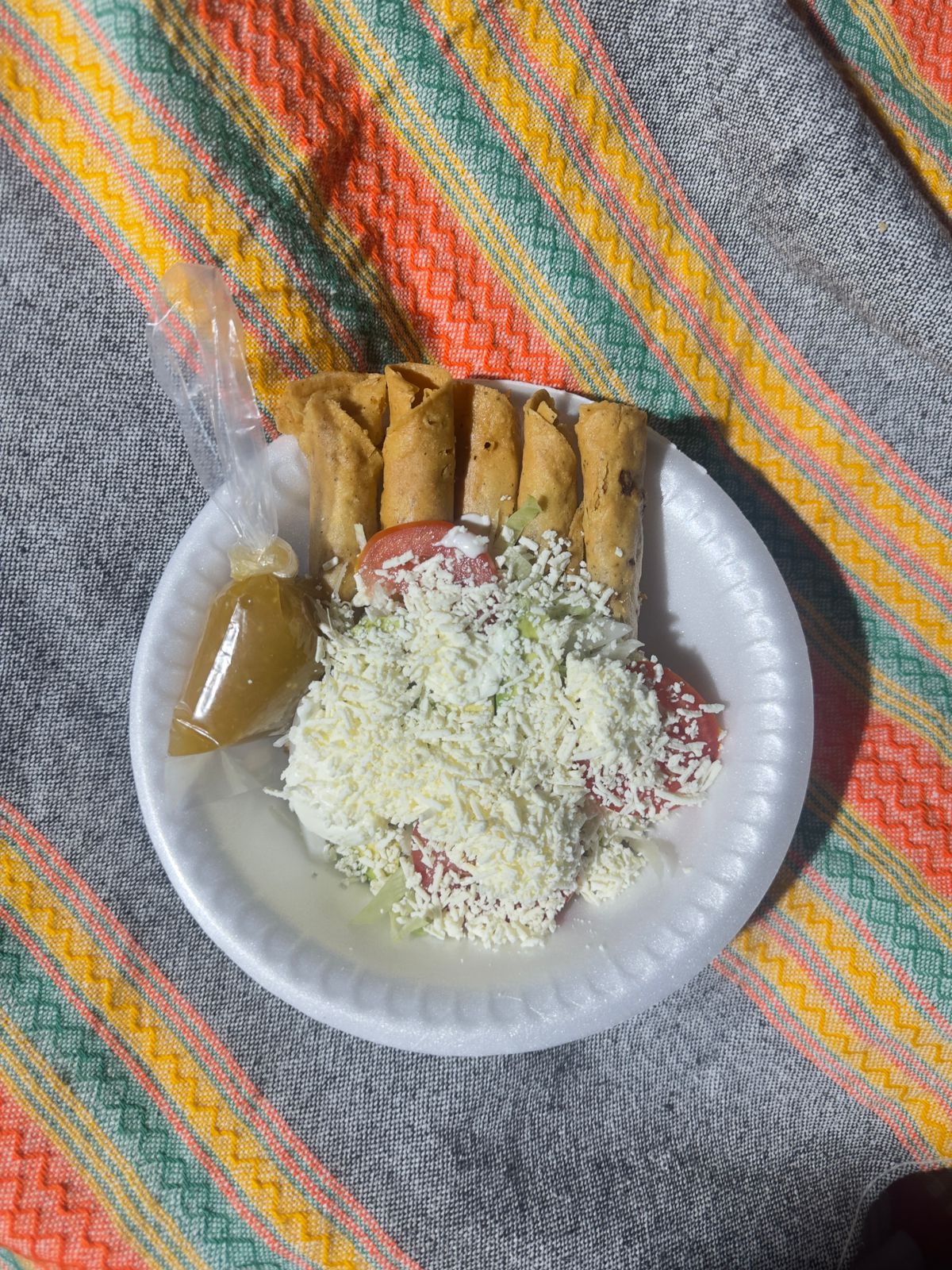 5 Tortillas rellenas de pollo, fritos en aceite, acompañados de caldo de pollo con vegetales, romanita, cebolla, jitomate, aguacate, crema, queso y salsa.