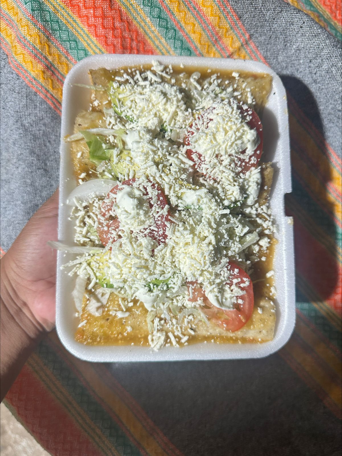 5 Tortillas rellenas de pollo, fritos en aceite, bañadas en salsa, romanita, cebolla, jitomate, aguacate, crema y queso.