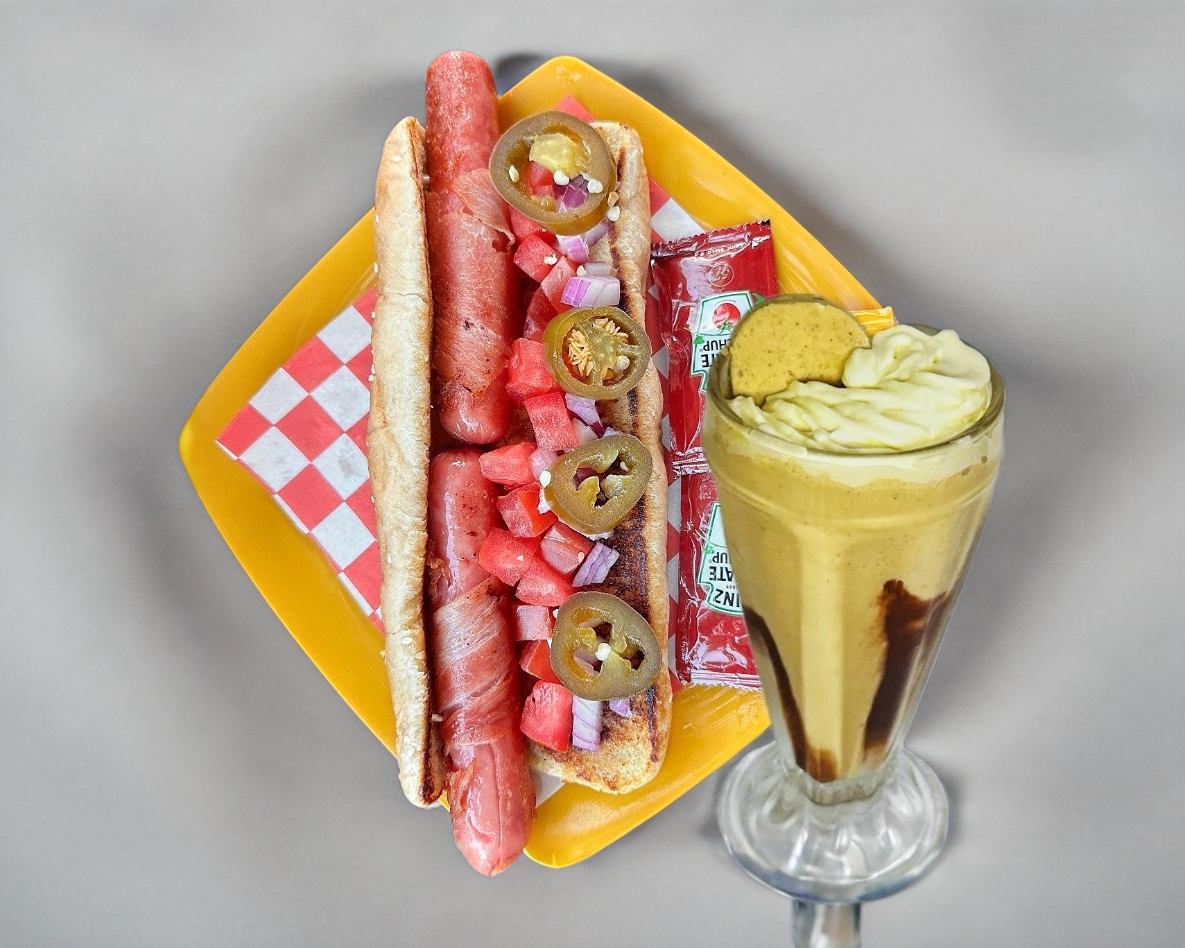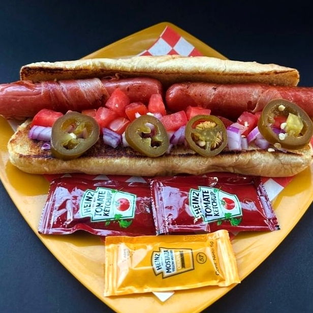 Pan wonder grande, doble salchicha envuelta en tocino, jitomate, cebolla, chiles en vinagre, mostaza y cátsup aparte.