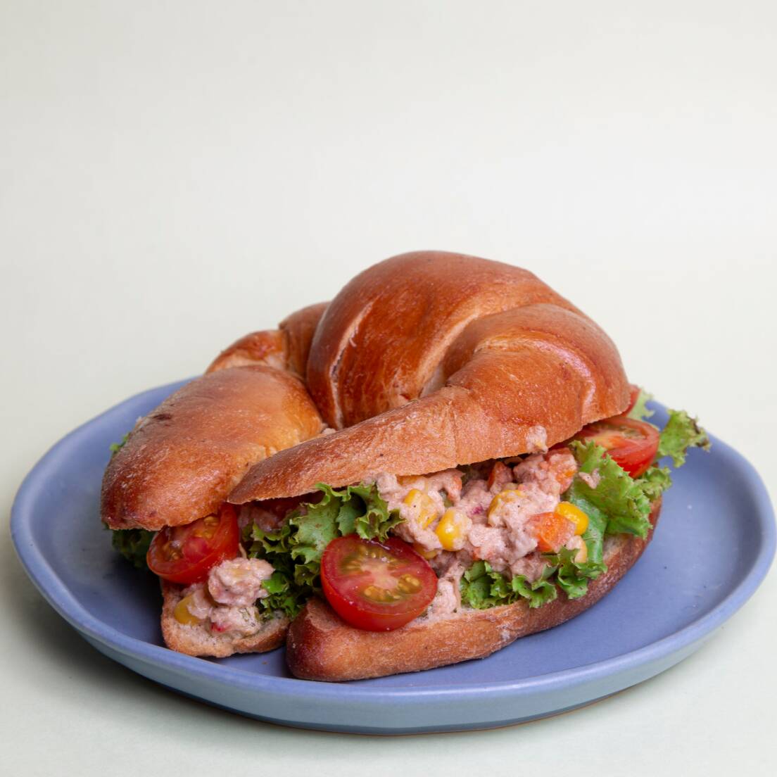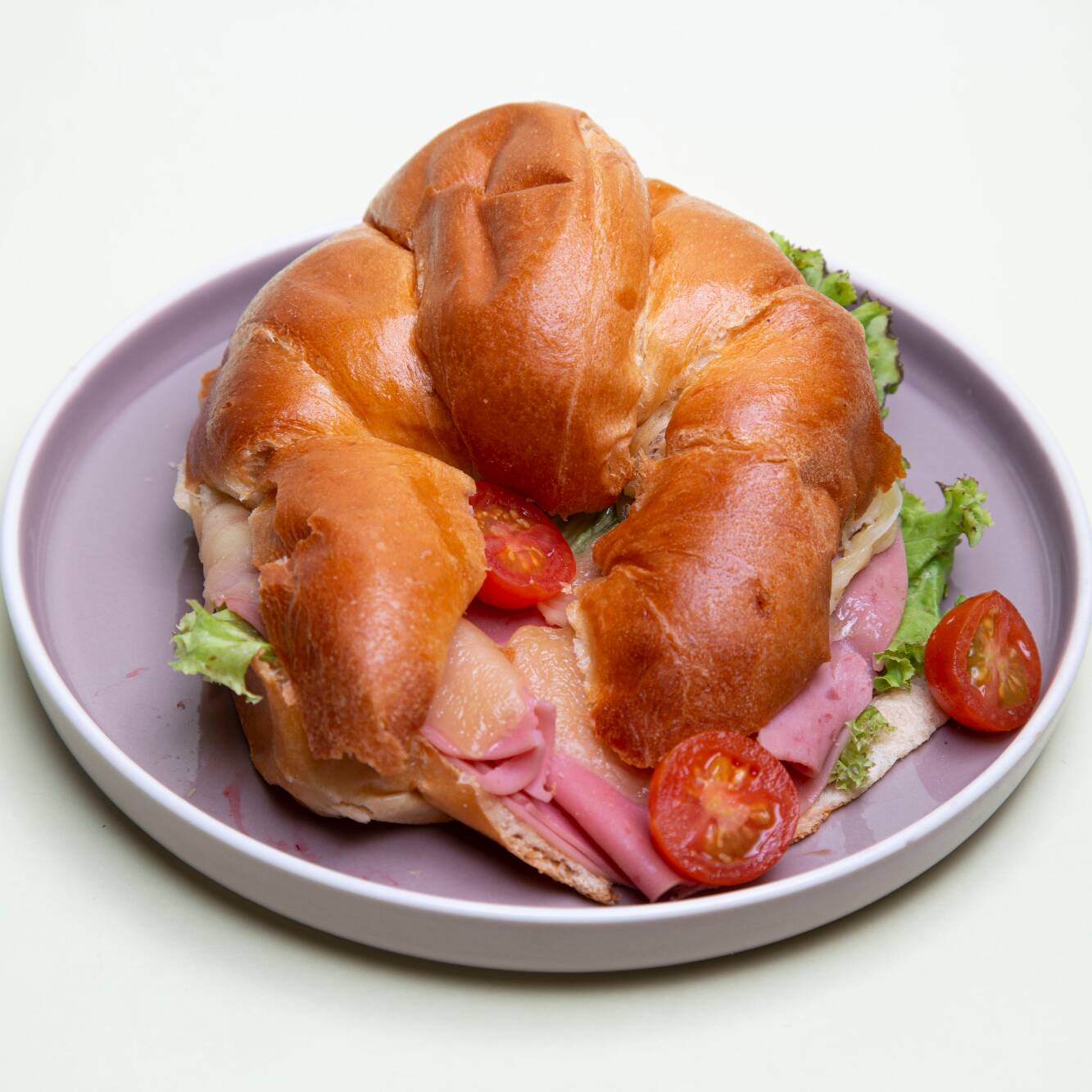 Panini de jamón, pepperoni y una mezcla de quesos, acompañado de papás chips y salsa.