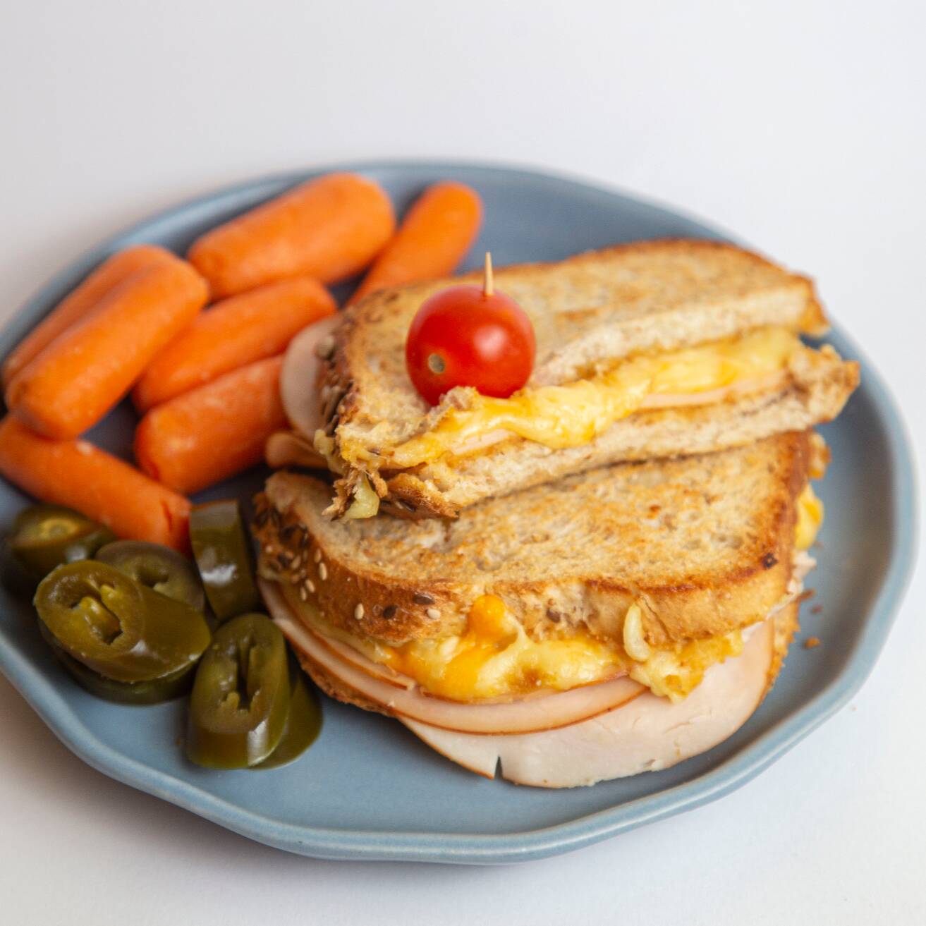 Sándwich con pan multigrano, pechuga de pollo, queso manchego y jamón.