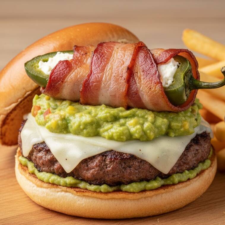 Jugosa carne de res con queso manchego, guacamole y jalapeño relleno de queso philadelphia envuelto en tocino. Incluye papas a la francesa, lechuga, jitomate y aderezo de la casa