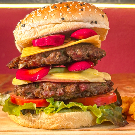 Doble carne de res casera con jamon, salchicha para asar, queso manchego, queso chihuahua y chorizo. Incluye papas a la francesa, lechuga, jitomate y aderezo de la casa.