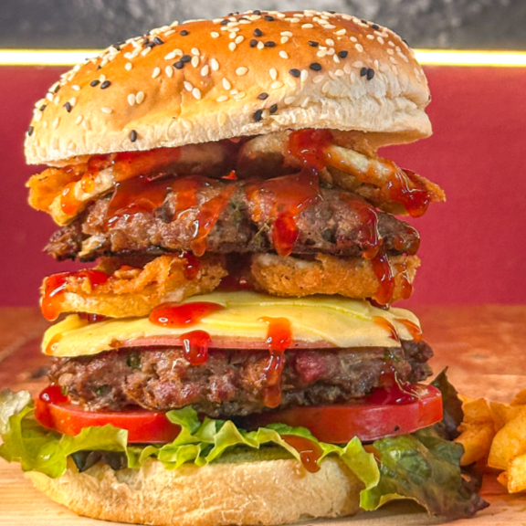 jugosa doble carne de res con jamona la plancha, mezcla de queso manchego y chihuahua, crujientes aros de cebolla, bañada en nuestra salsa BBQ de la casa. Incluye papas a la francesa, lechuga y jitomate.