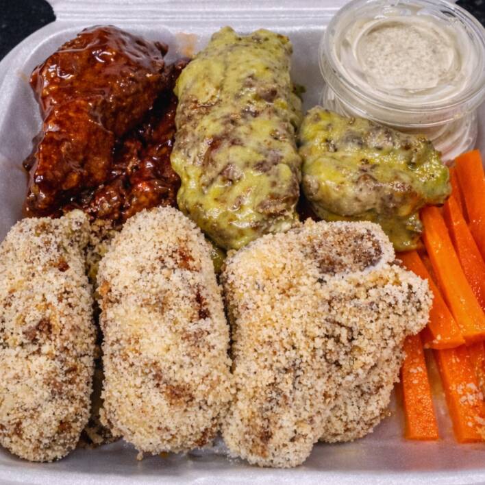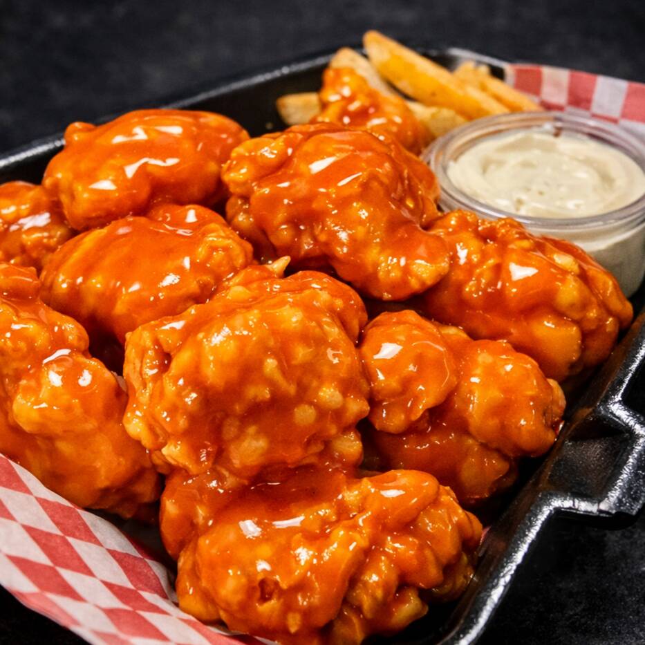 5 boneless crujientes de pechuga de pollo bañados en la salsa de tu eleccion. Incluye zanahoria, apio y aderezo ranch.