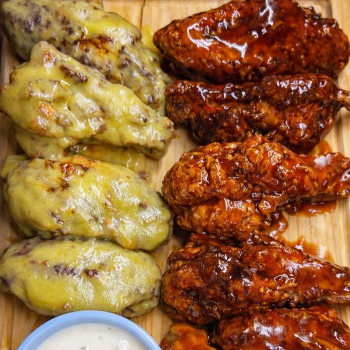5 alitas crujientes bañadas en la salsa de tu eleccion. Incluye Zanahoria, apio y aderezo ranch.