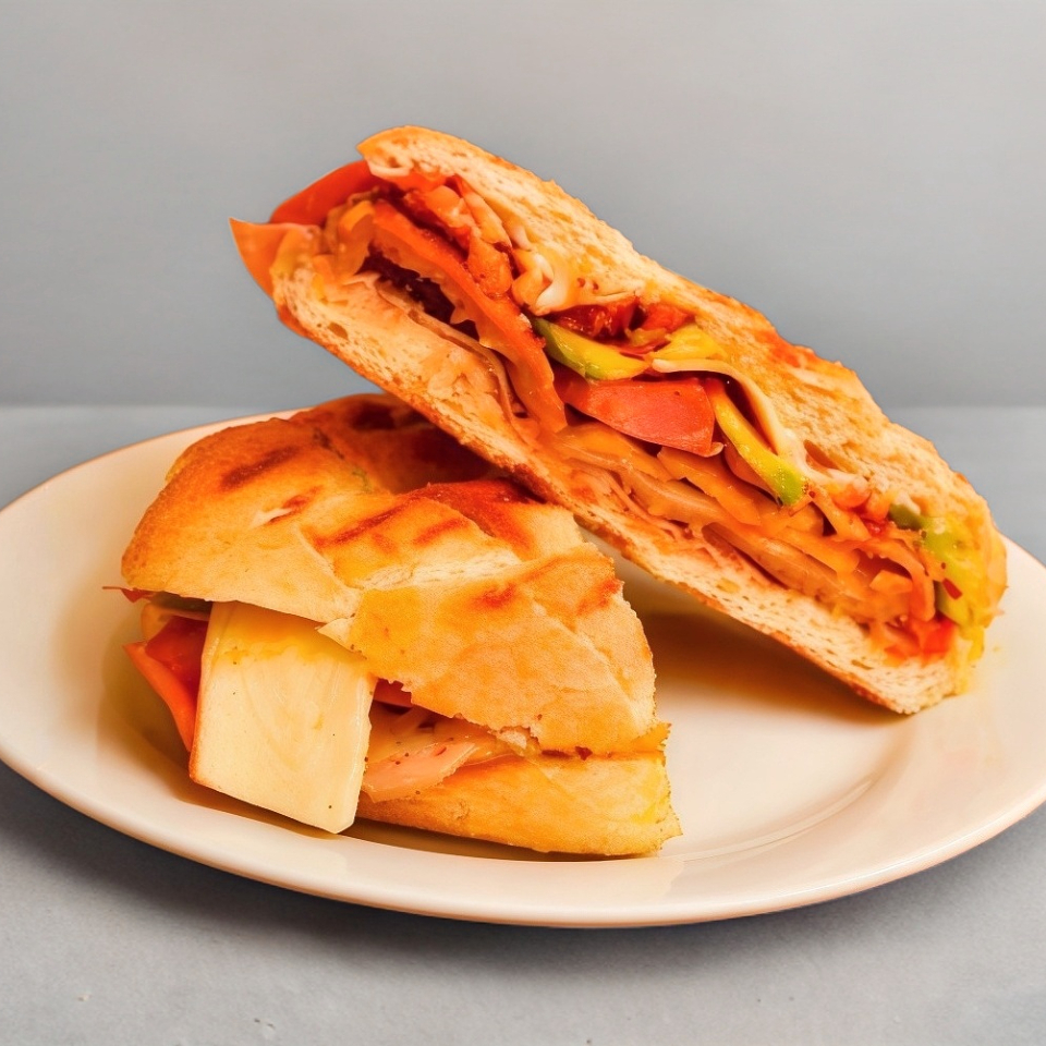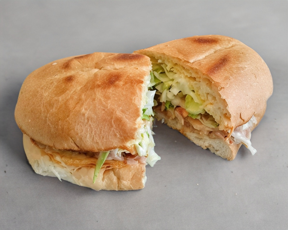Pan chiabata relleno de peperoni con queso manchego y verdura