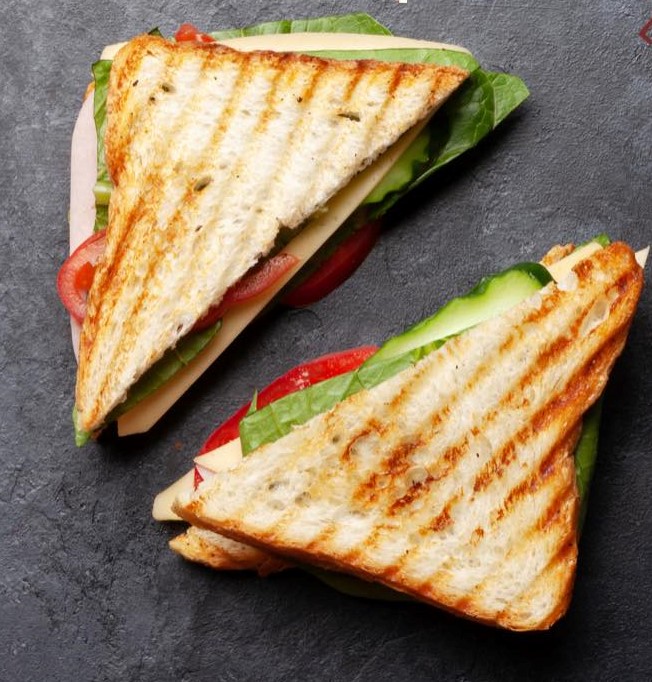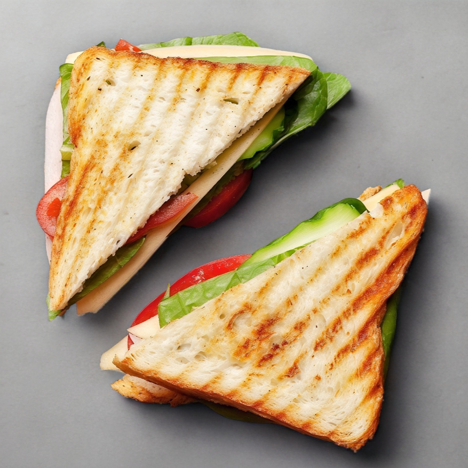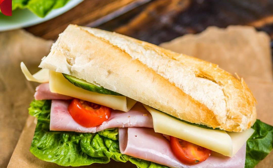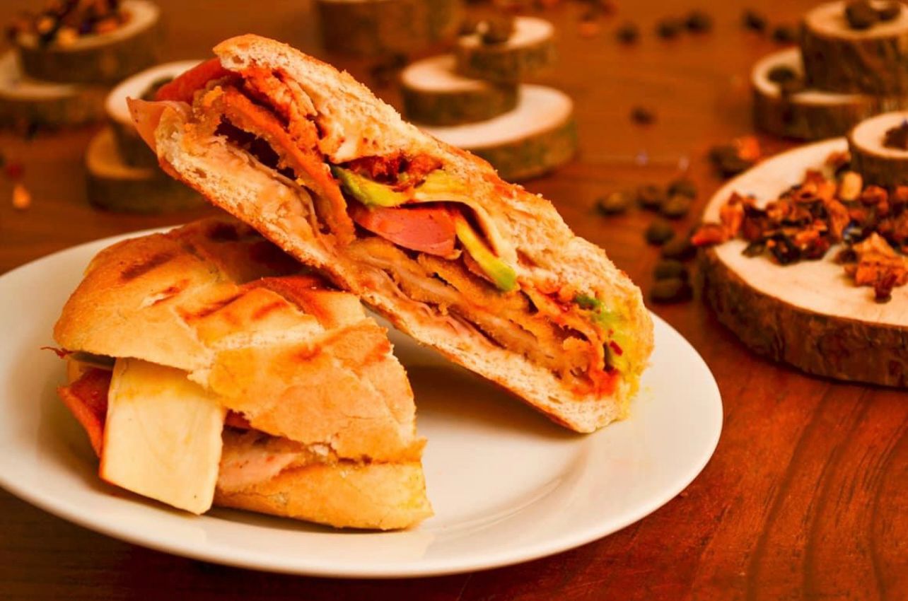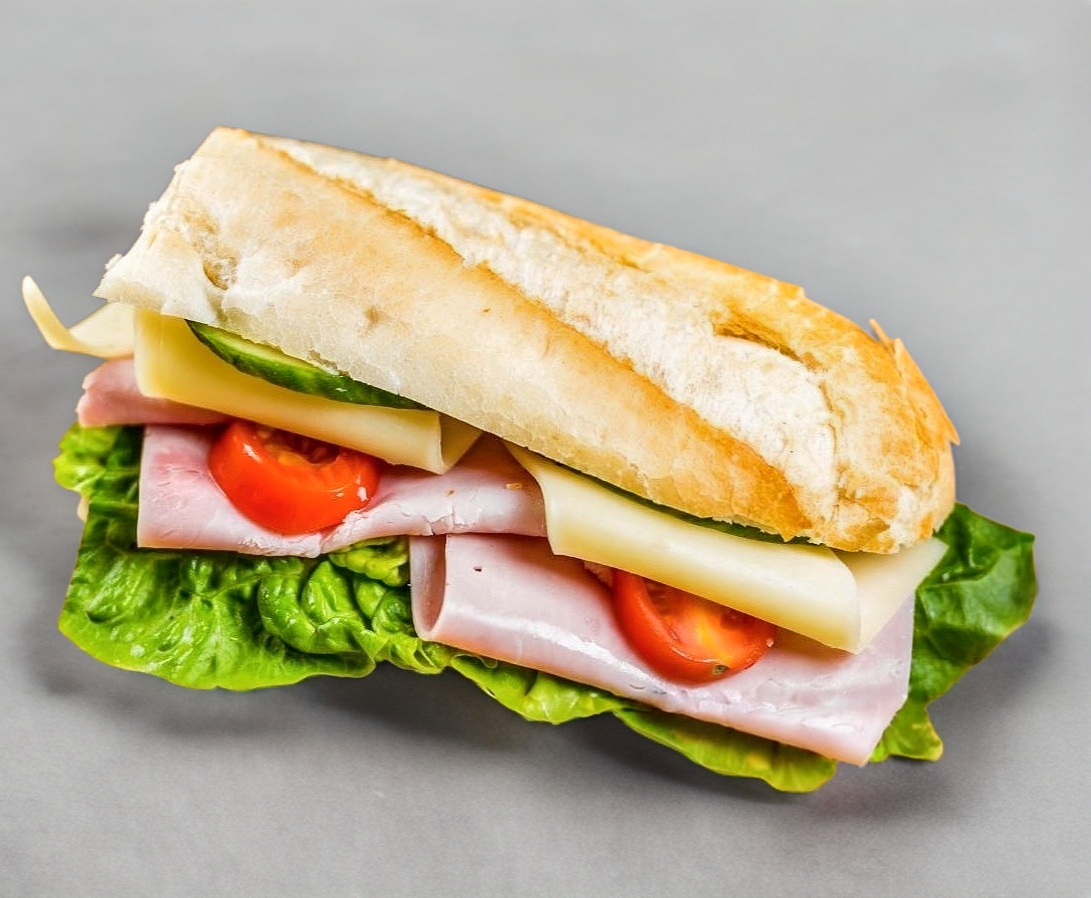 Pan ciabatta relleno de jamón de pavo, queso manchego y verduras: jitomate y cebolla.