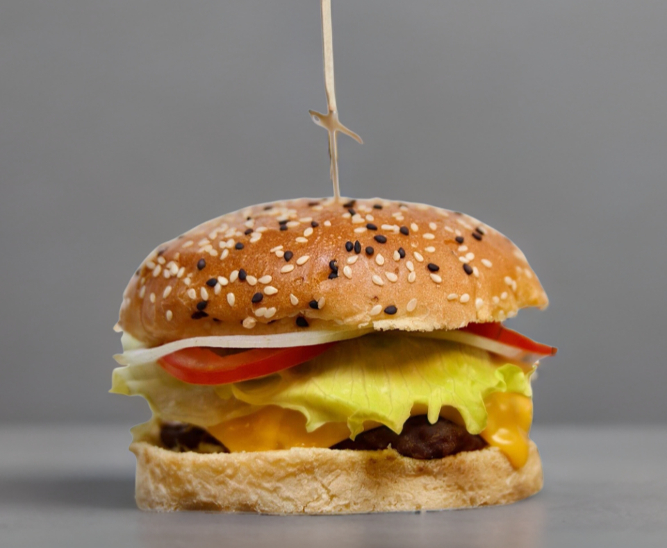 jugosa carne de res, queso americano,verdura, pan artesanal acompañada con papas a la francesa