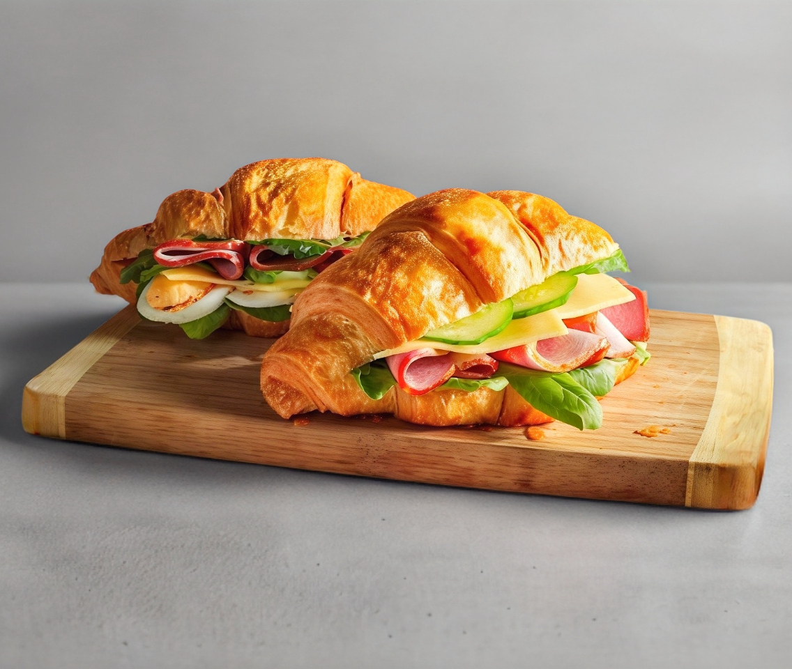 cuernito de mantequilla relleno con jamon de pavo ,queso manchego y verdura acompañado de papas a la francesa