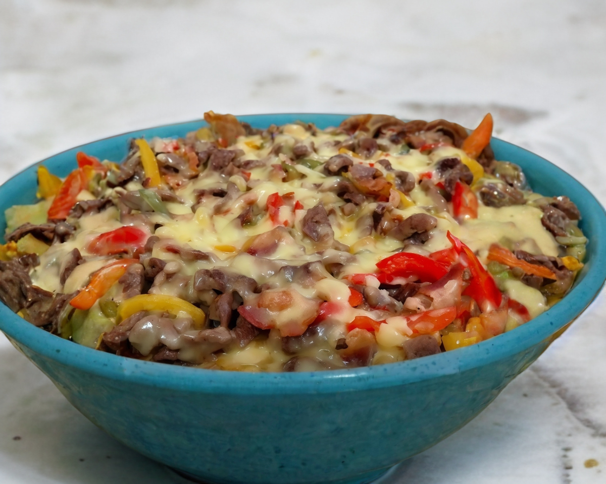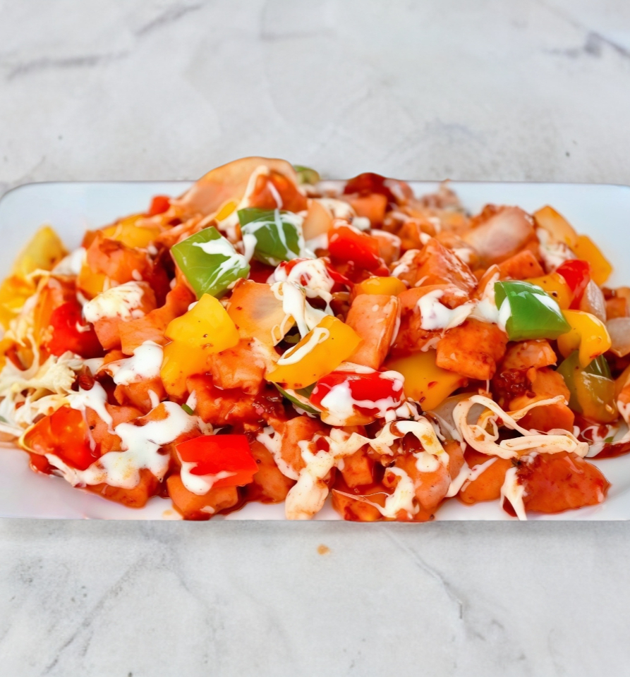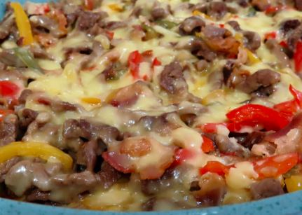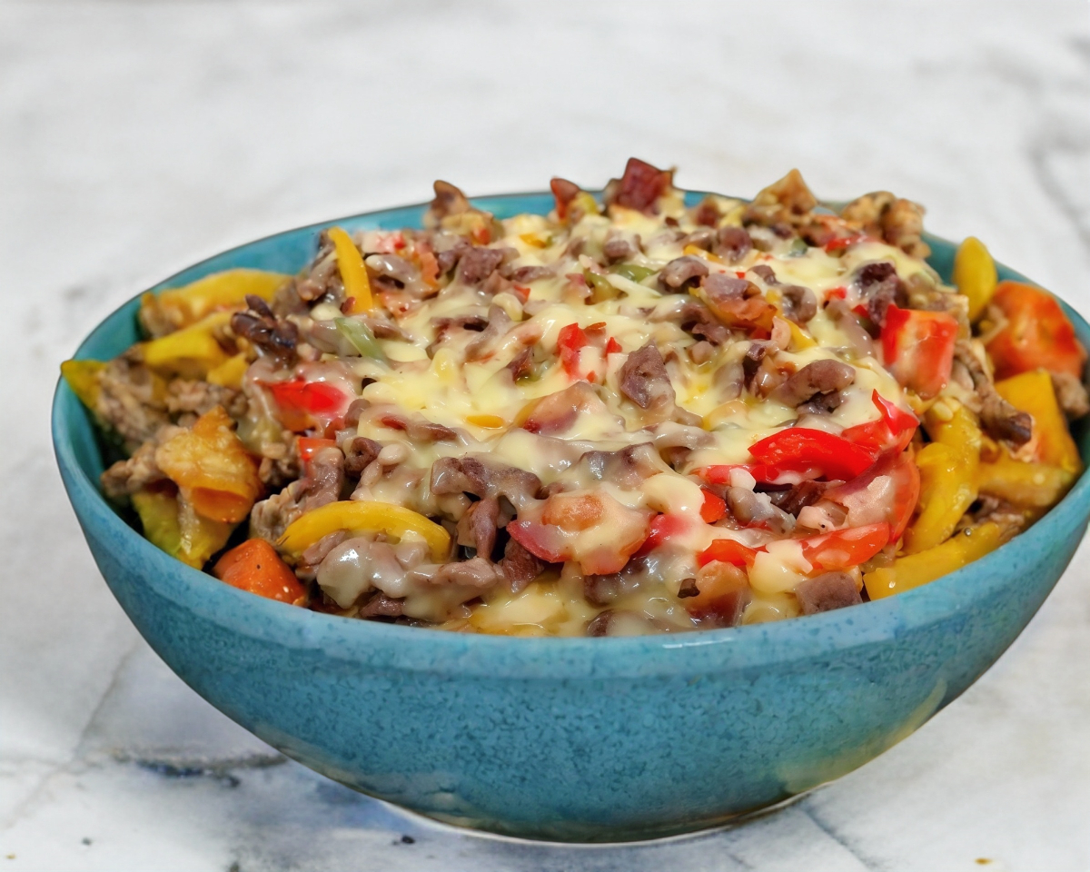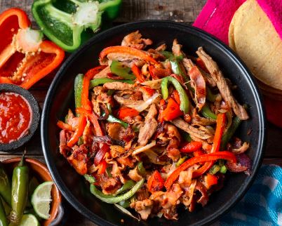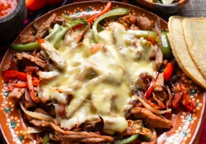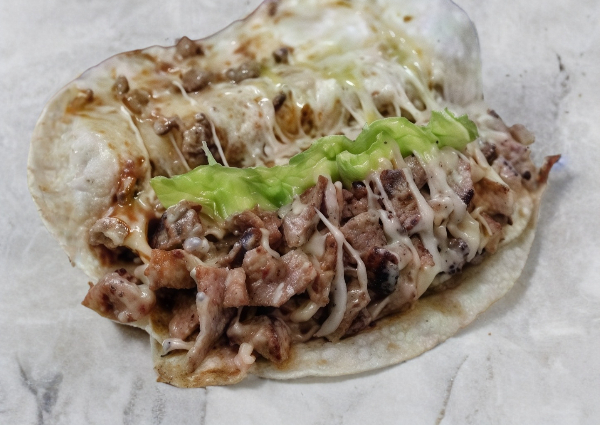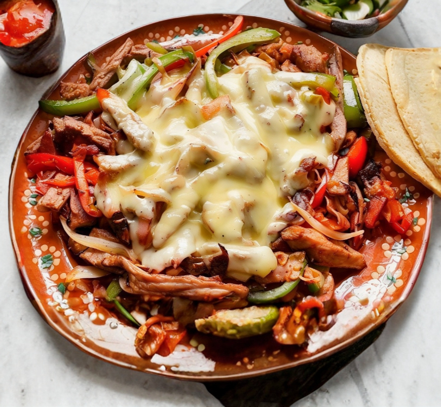 Pastor, bistec, cebolla, morrón, jitomate y queso.