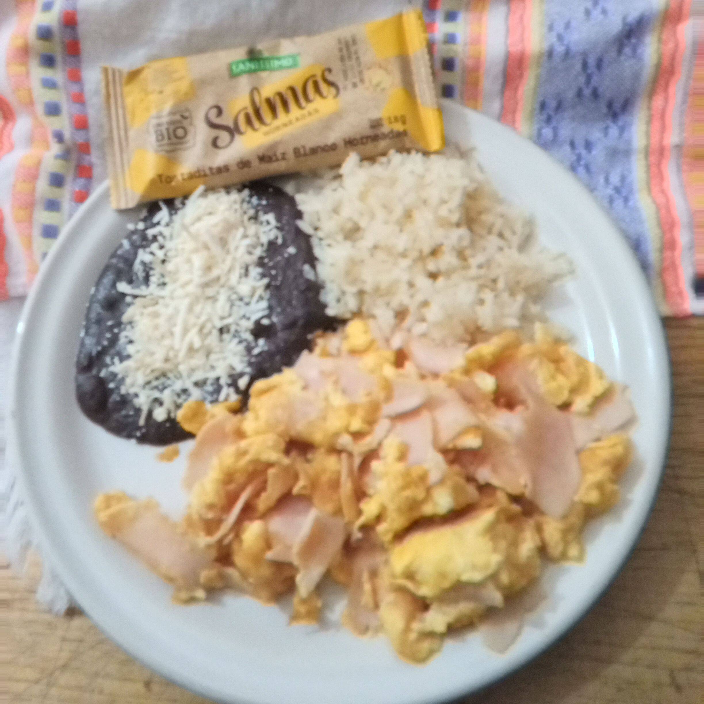 Huevos con jamón, incluye frijoles, arroz o ensalada,galletas salmas
