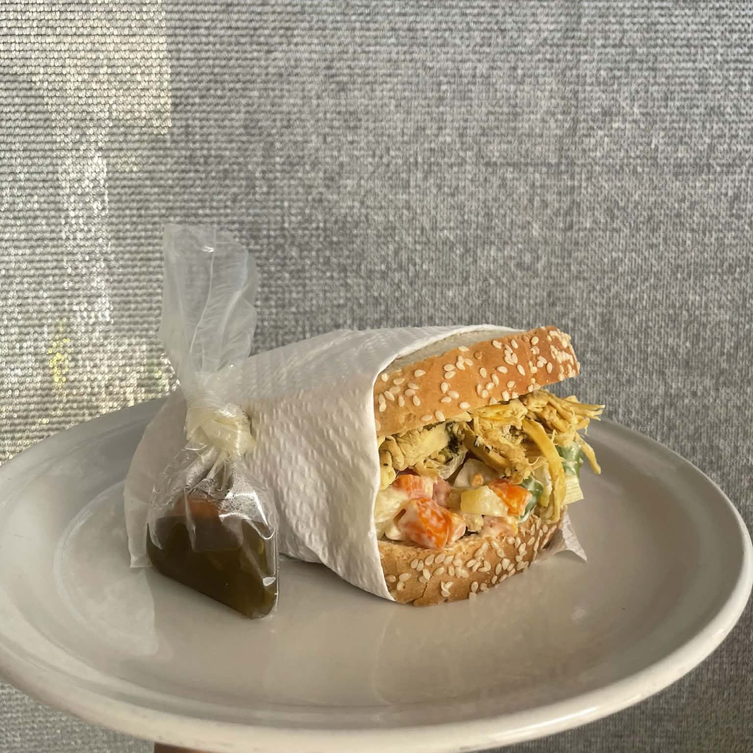 Sándwich de ensalada rusa con pollo desmenuzado y chile en vinagre.