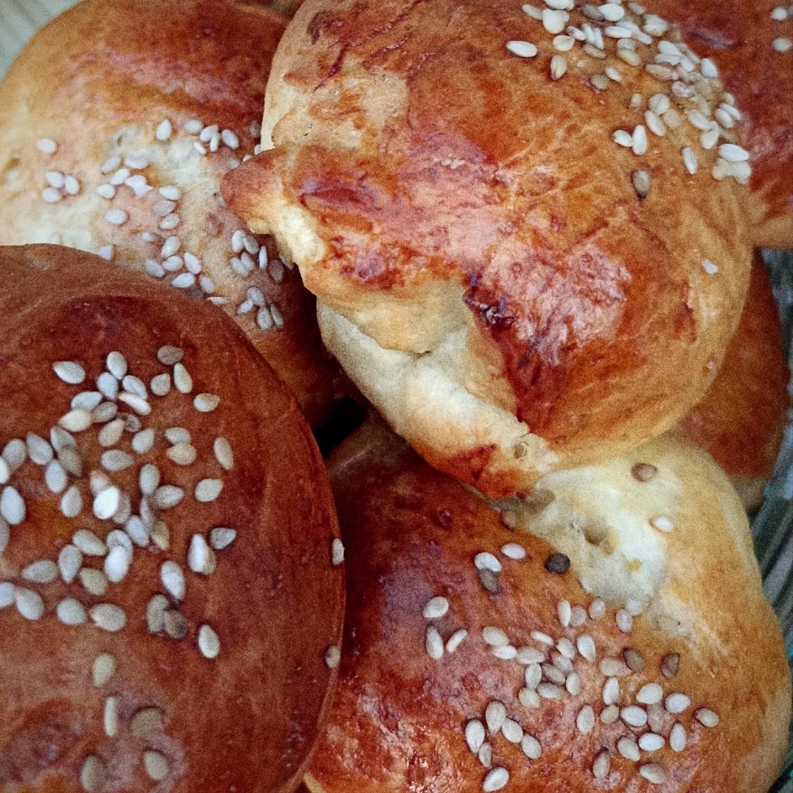 Pan recién horneado relleno de queso crema, con ajonjolí