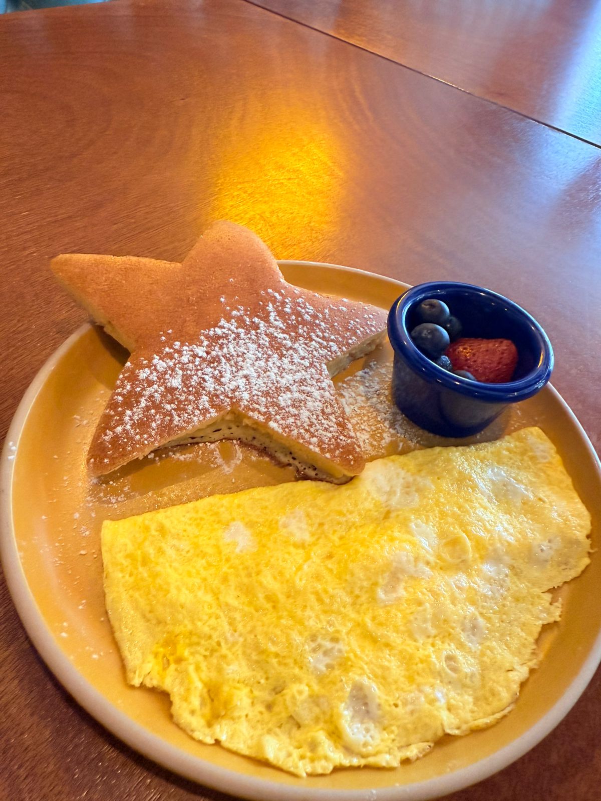 Par de huevos revueltos, 1 pieza de hotcake con fruta y un jugo.