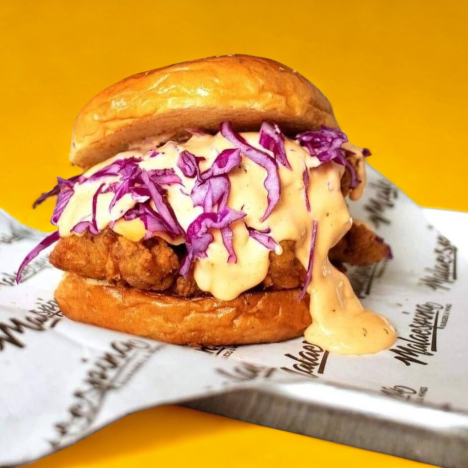 Muslo de pollo crispí, queso cheddar, ensalada de col morada con aderezo con pan artesanal.