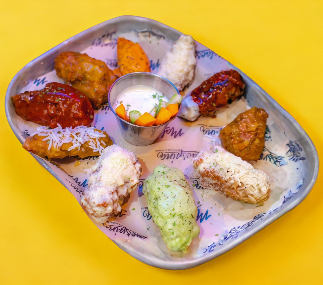 5 alitas, acompañadas de aderezo ranch y crudités de apio y zanahoria por aparte. Puedes elegir hasta 2 salsas y puedes agrandar si lo deseas.